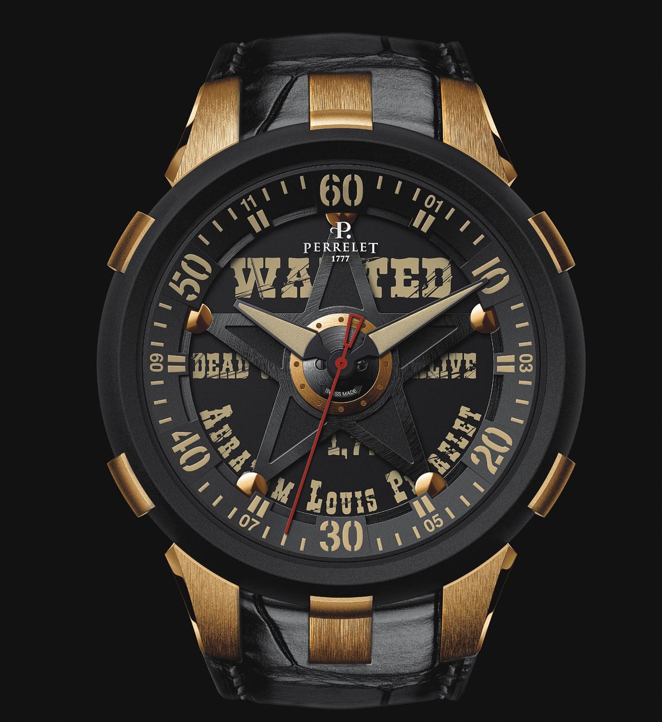 The standout originality of the watch lies in the dial, on which the customary blades of Perrelet’s iconic Turbine model have been replaced by a black gold-tipped sheriff’s star. As it turns, the latter reveals a humoristic inscription on the under-dial in reference to the great American Western movies.