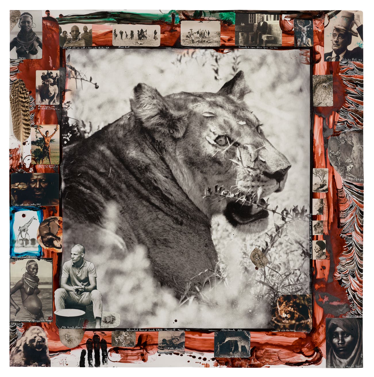 Unique work, comprising a gelatin silver print with applied blood, paint, ink, glitter, affixed feather and photographs, executed later.