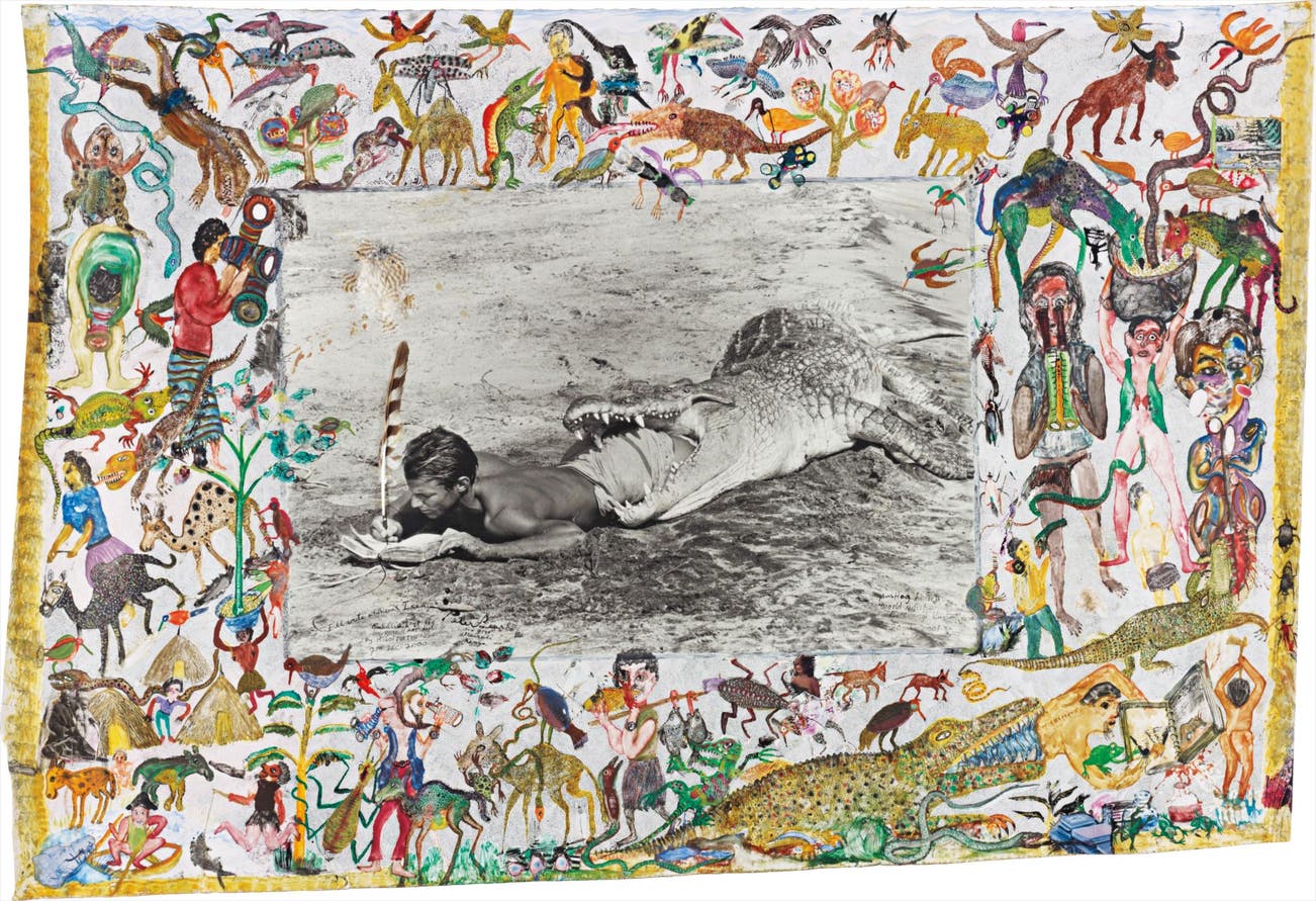 Here in this lot we see some of his distinct trademarks; collage, photography, ink, paint and affixed objects. In content, Beard’s works resemble a time capsule aided and constructed via the recording medium of photography. His works are his life; fragmentary moments pieced together, the glue being the natural species that he so reveres. To be in the company of a work by Peter Beard is somehow to acquire a ‘texture’ of him: to attain a small part of his addictive personality, to be suspended in a magical dream for a moment – only to have our eco conscience abruptly awoken from the initial euphoric rush.