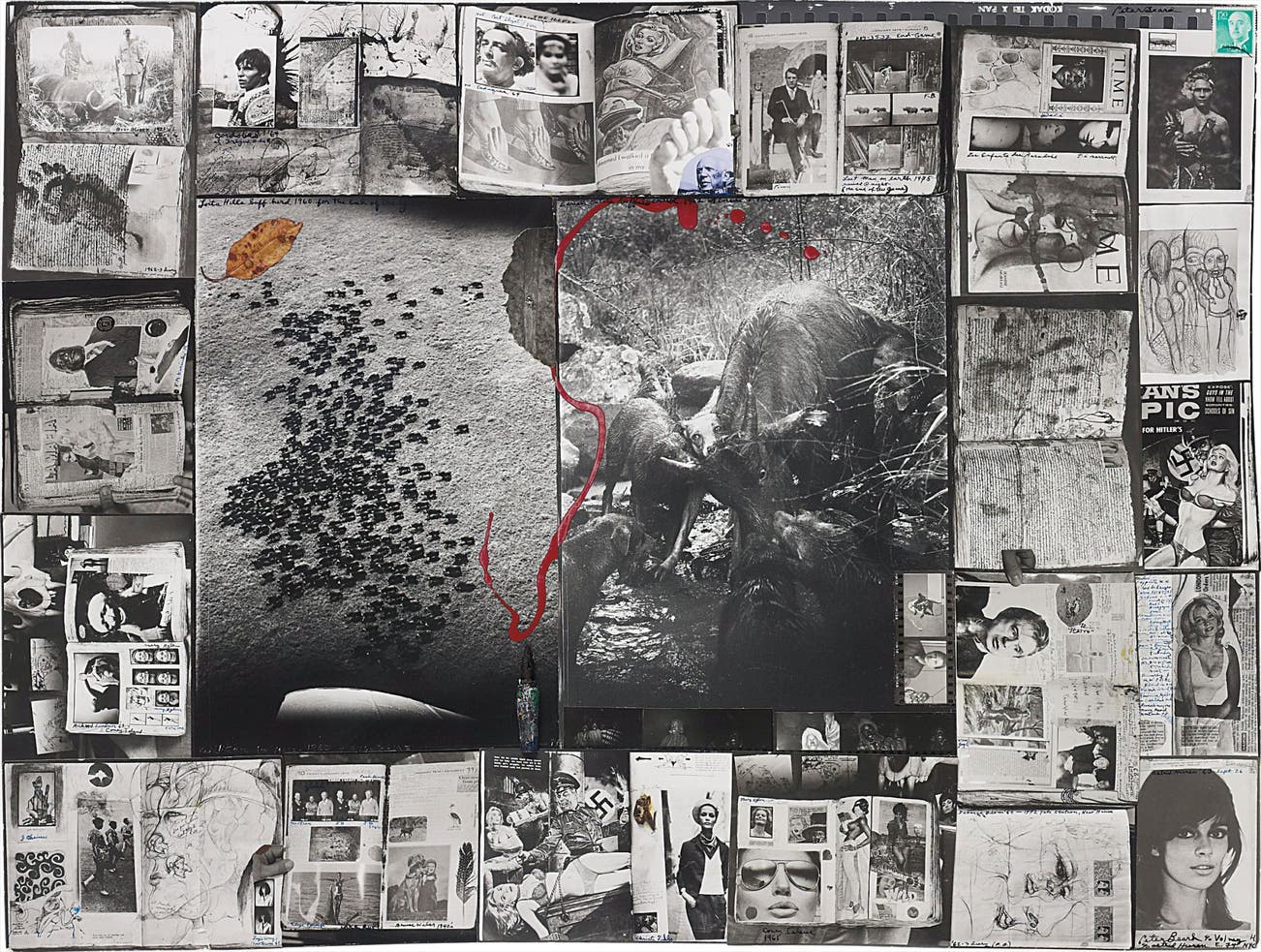 Gelatin silver print with ink, paint and affixed gelatin silver prints, fountain pen nib, leaf, dried insect and stamp, printed later.