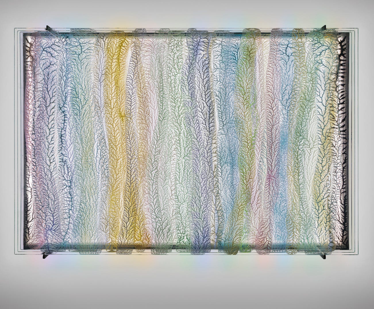 acrylic paint, tempered glass (5 layers), LED flat light panel, remote dimmer and steel bracket