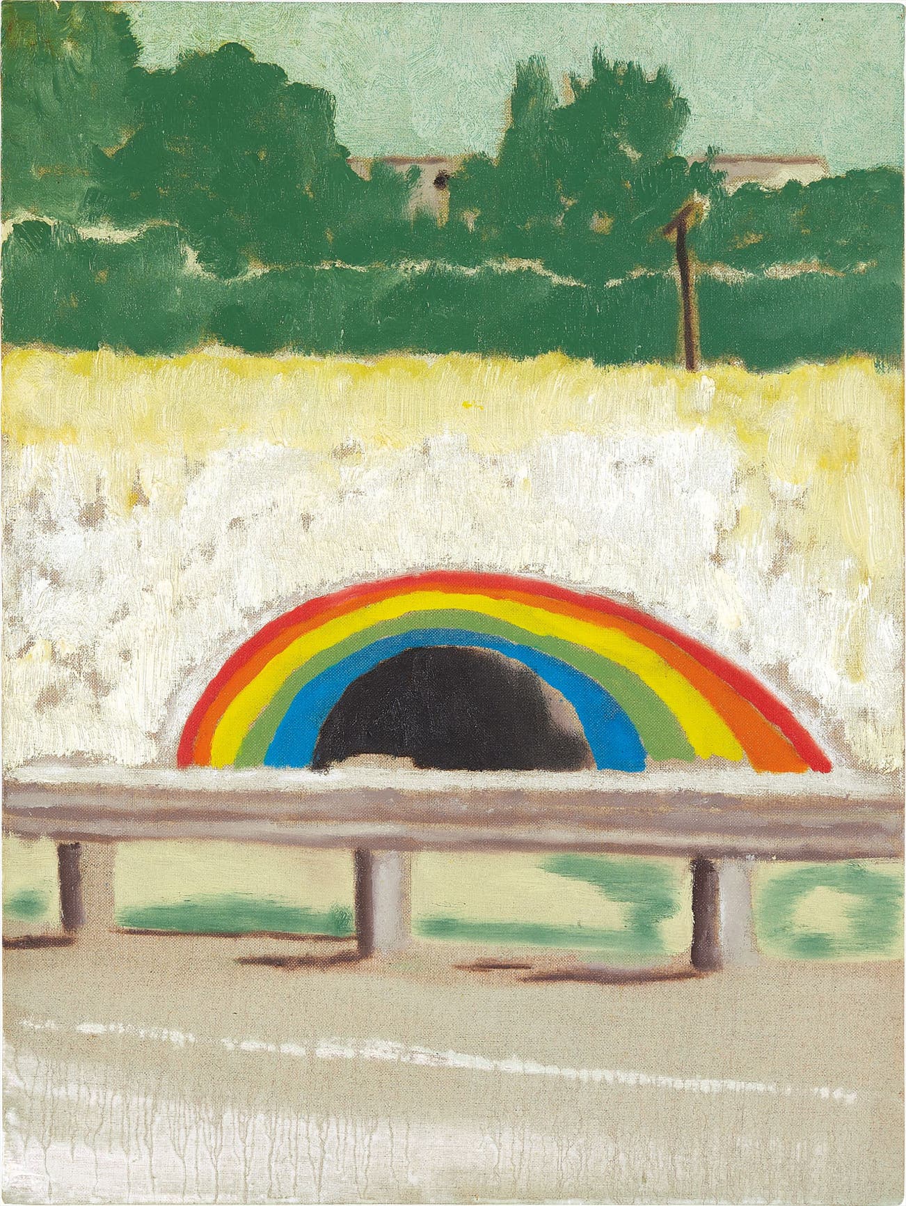 Between 1998 and 2000, Doig painted three monumental works centred on the Don Valley rainbow, one of which is presently in the collection of the Pinchuk Art Centre in Kiev whilst another was chosen as the lead illustration for the artist’s seminal retrospective at the Tate Britain in 2008. Despite only featuring in three major canvasses, Doig made a number of paintings, drawings, watercolours and aquatints that retell this unique experience, the mysterious view from the car seen by millions of commuters over several decades. The deep blackness of the tunnel’s centre is enigmatic, at once suggestive of an entrance to another realm whilst also depicting an anonymous marginal urban space. As Doig has commented, ’a lot of the works deal with peripheral or marginal sites, places where the urban world meets the natural world. Where the urban elements almost become, literally, abstract devices. There are a lot of ‘voids’ in the paintings. A lot of the paintings portray a sense of optimism that can often be read as being a little desperate, like the image of a rainbow painted around the entrance to an underpass.’ (Peter Doig in Adrian Searle, Kitty Scott and Catherine Grenier, Peter Doig, London, 2007, p. 139).