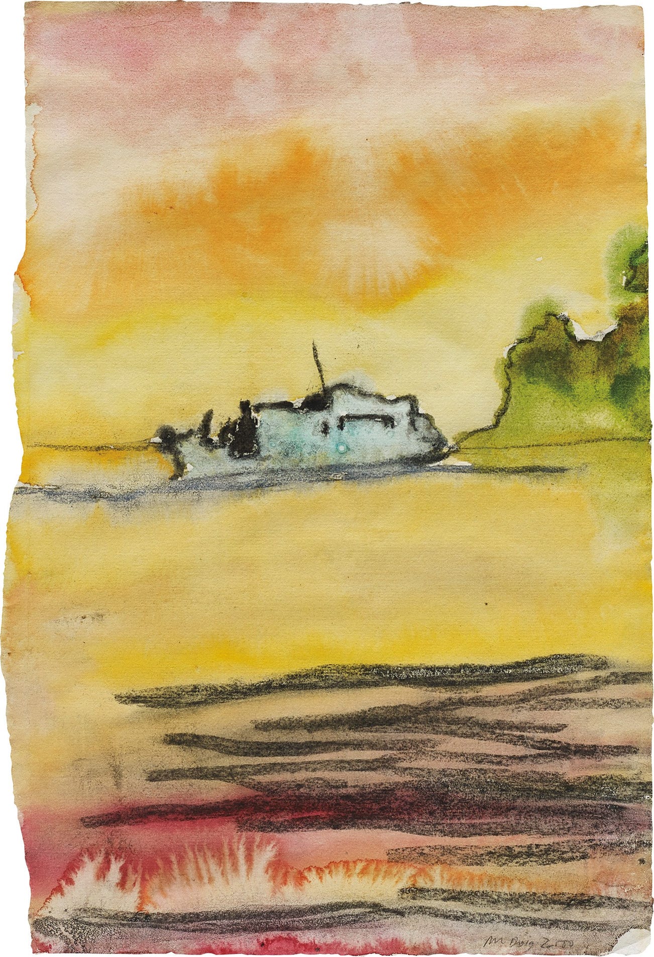 Doig draws on personal memories and source imagery in his pursuit of exploring the slippage between reality, imagination and memory through painting. The material properties of paint and expressive possibilities of color thereby serve to approximate the foggy, inarticulate sensation of remembering. His practice maintains a thin and balanced line between landscape and figure, superimposing photographic imagery and memories, both real and imagined.