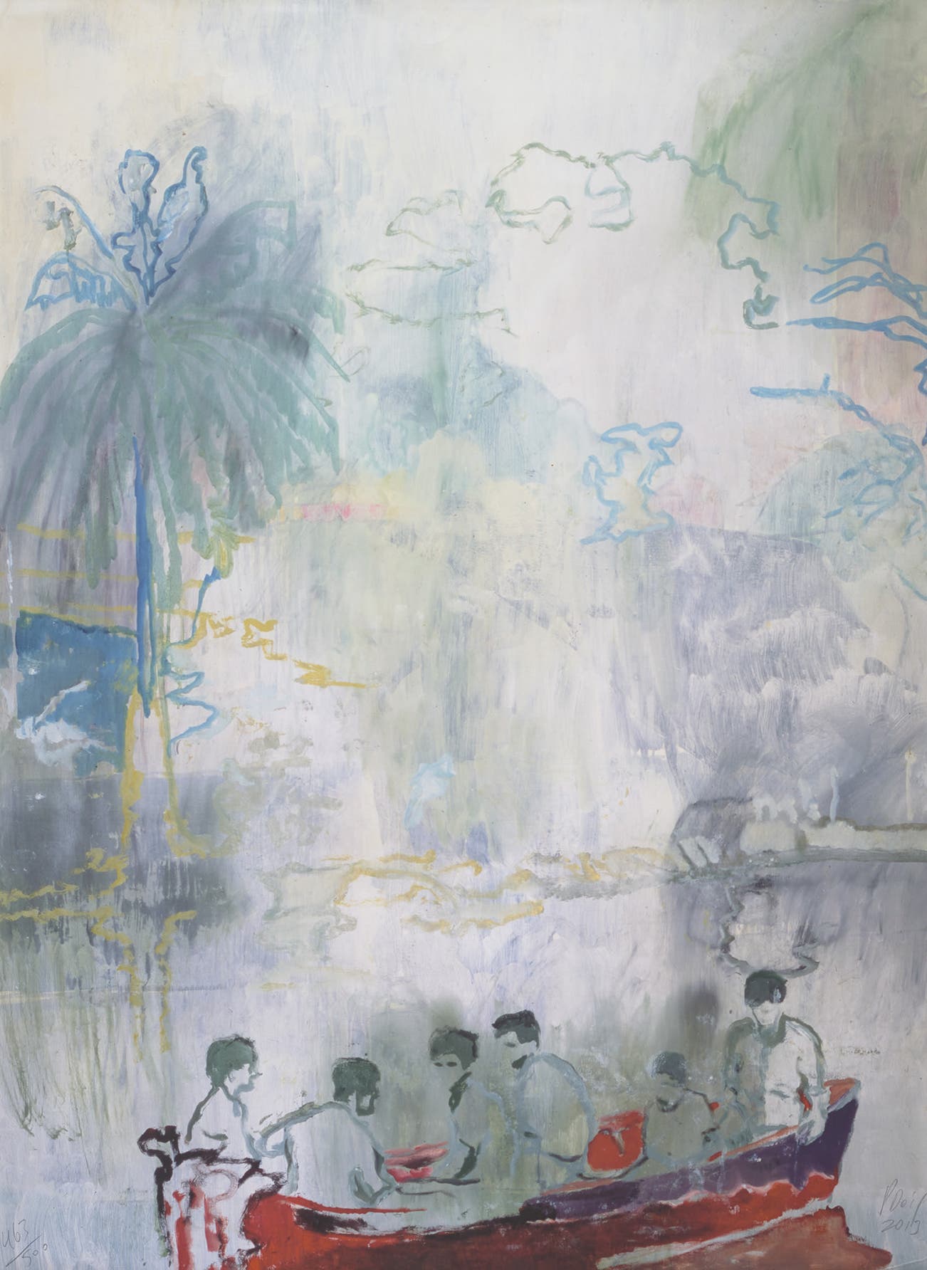 Doig draws on personal memories and source imagery in his pursuit of exploring the slippage between reality, imagination and memory through painting. The material properties of paint and expressive possibilities of color thereby serve to approximate the foggy, inarticulate sensation of remembering. His practice maintains a thin and balanced line between landscape and figure, superimposing photographic imagery and memories, both real and imagined.