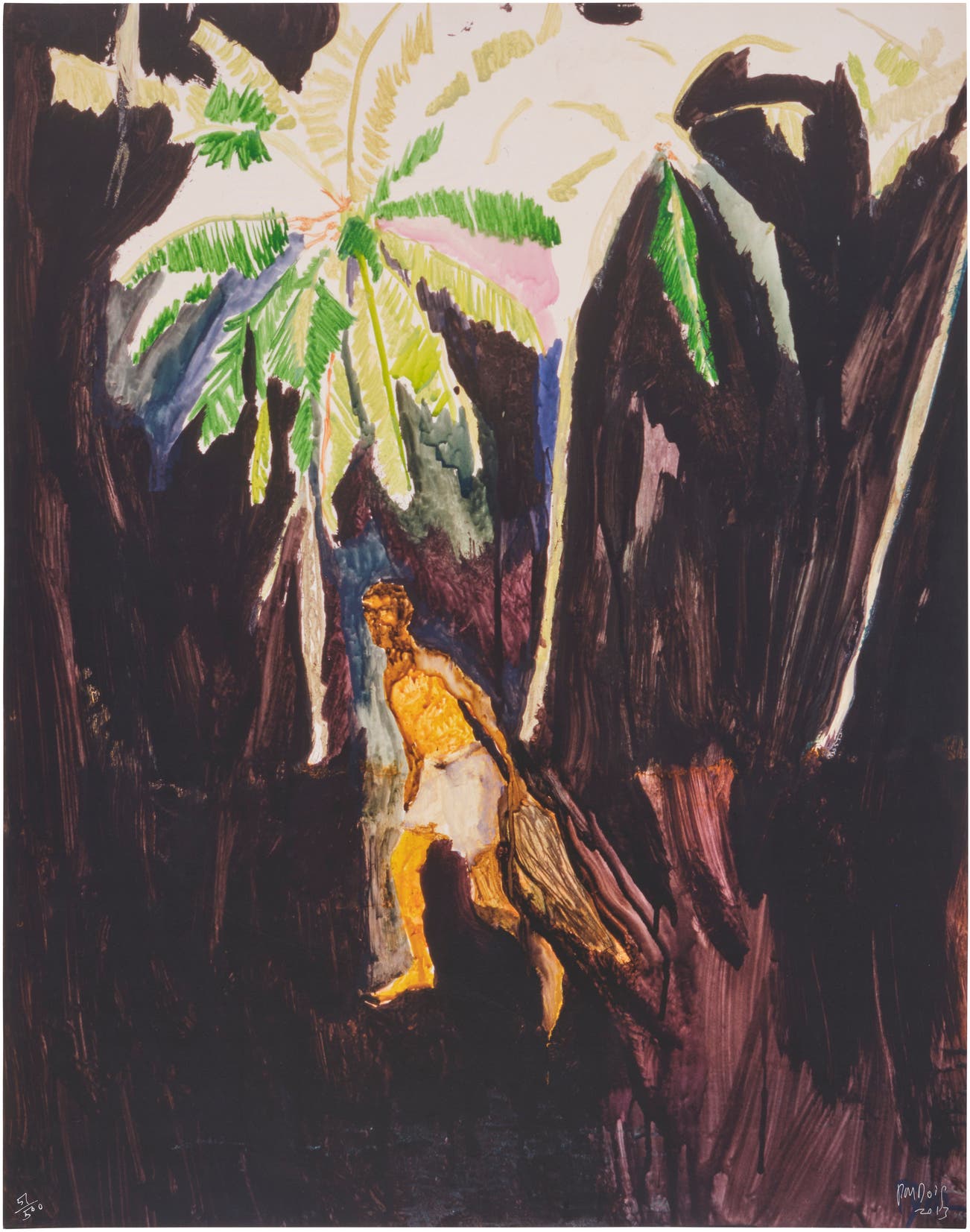 Doig draws on personal memories and source imagery in his pursuit of exploring the slippage between reality, imagination and memory through painting. The material properties of paint and expressive possibilities of color thereby serve to approximate the foggy, inarticulate sensation of remembering. His practice maintains a thin and balanced line between landscape and figure, superimposing photographic imagery and memories, both real and imagined.