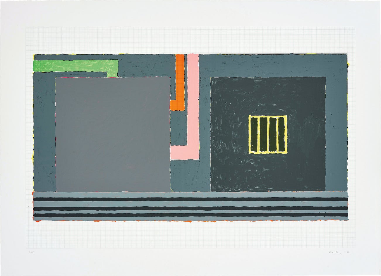 Screenprint in colours with blue grid imprint, on Arches paper, with full margins.