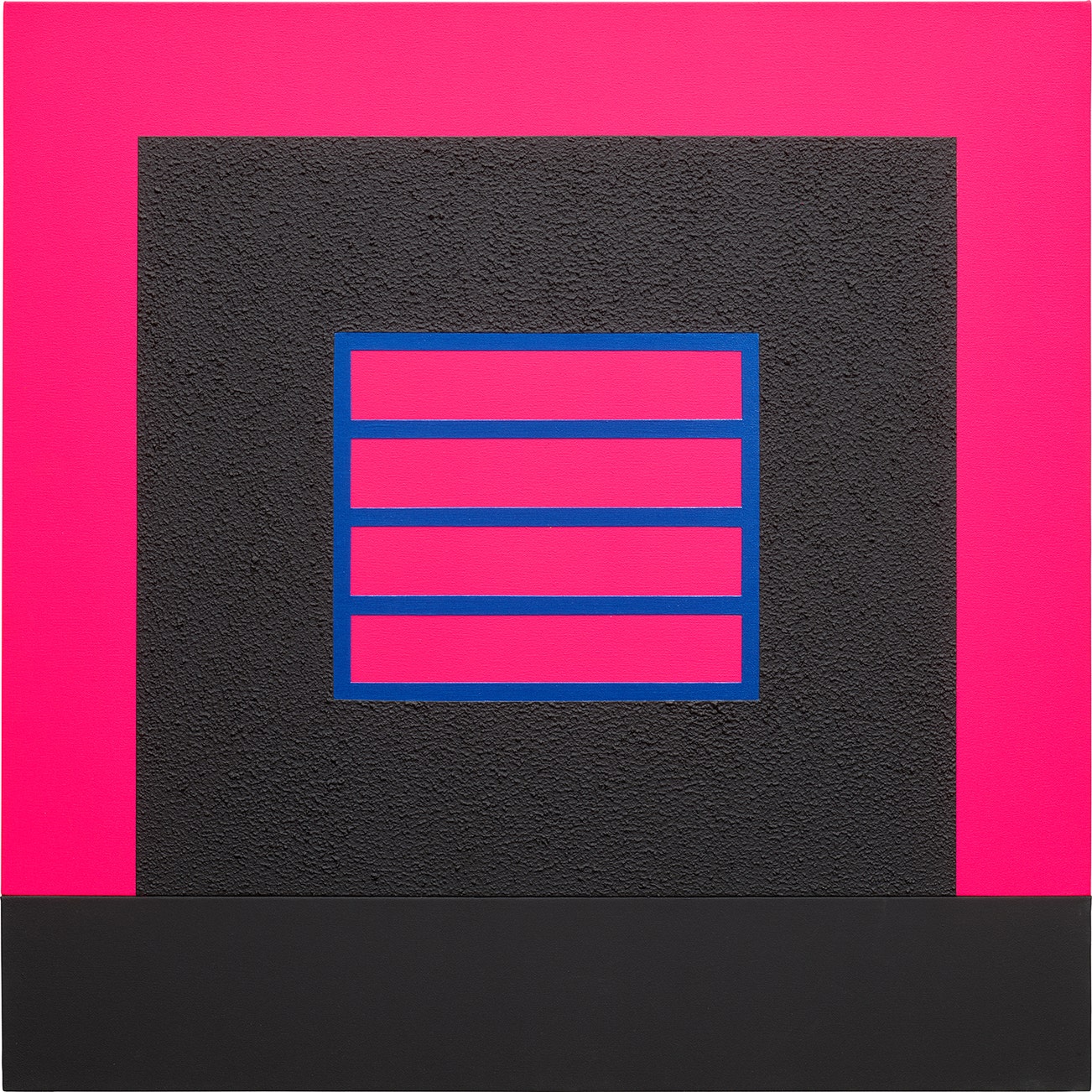 acrylic, fluorescent and pearlescent acrylic, and Roll-a-Tex on canvas