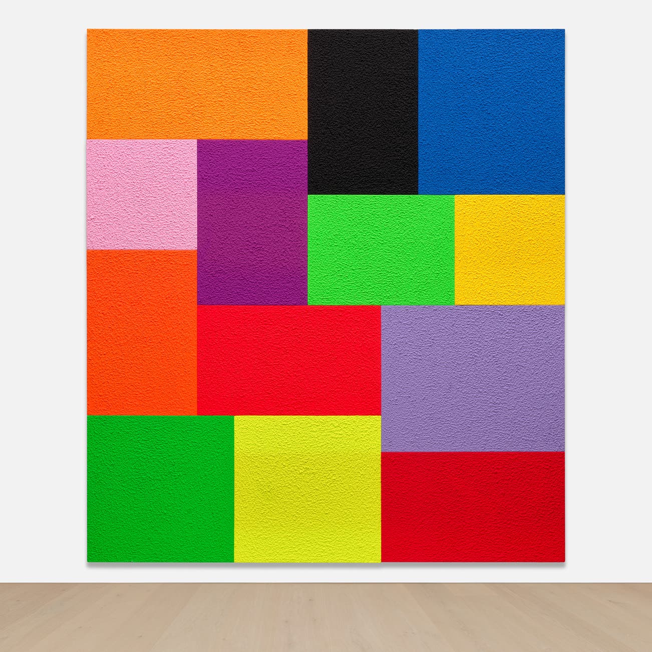 acrylic, fluorescent acrylic and Roll-a-Tex on canvas