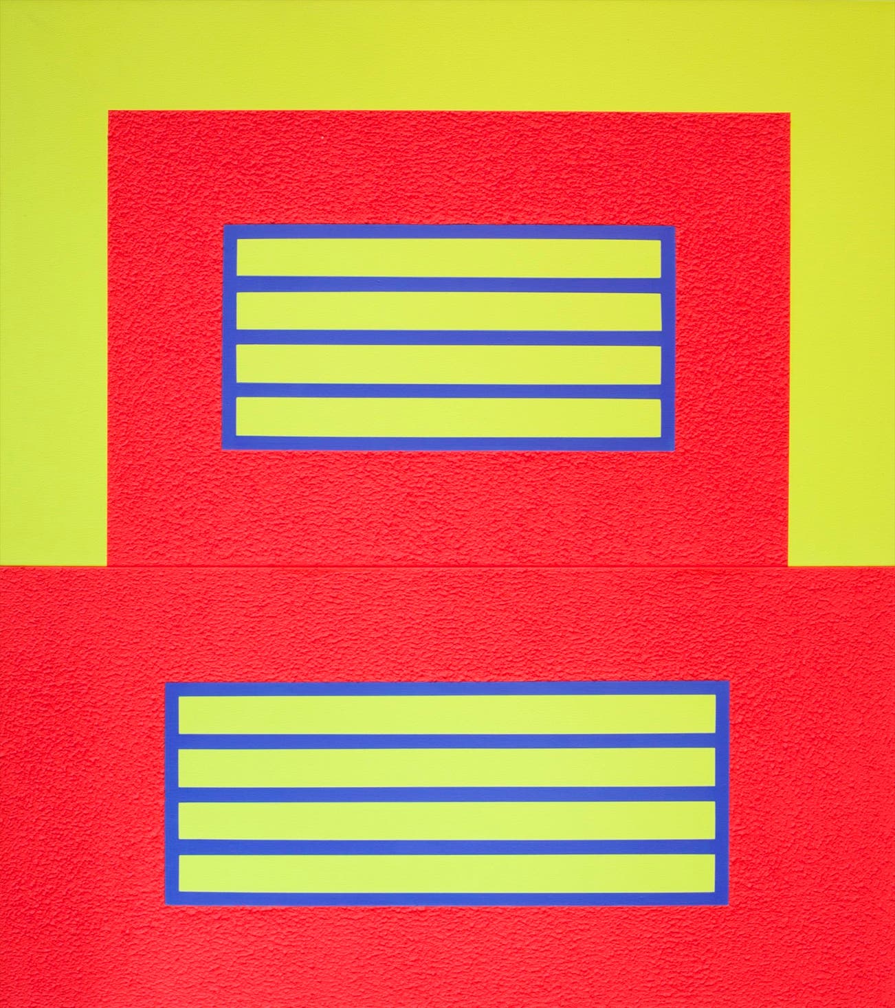 acrylic Day-Glo paint and Roll-a-Tex on canvas