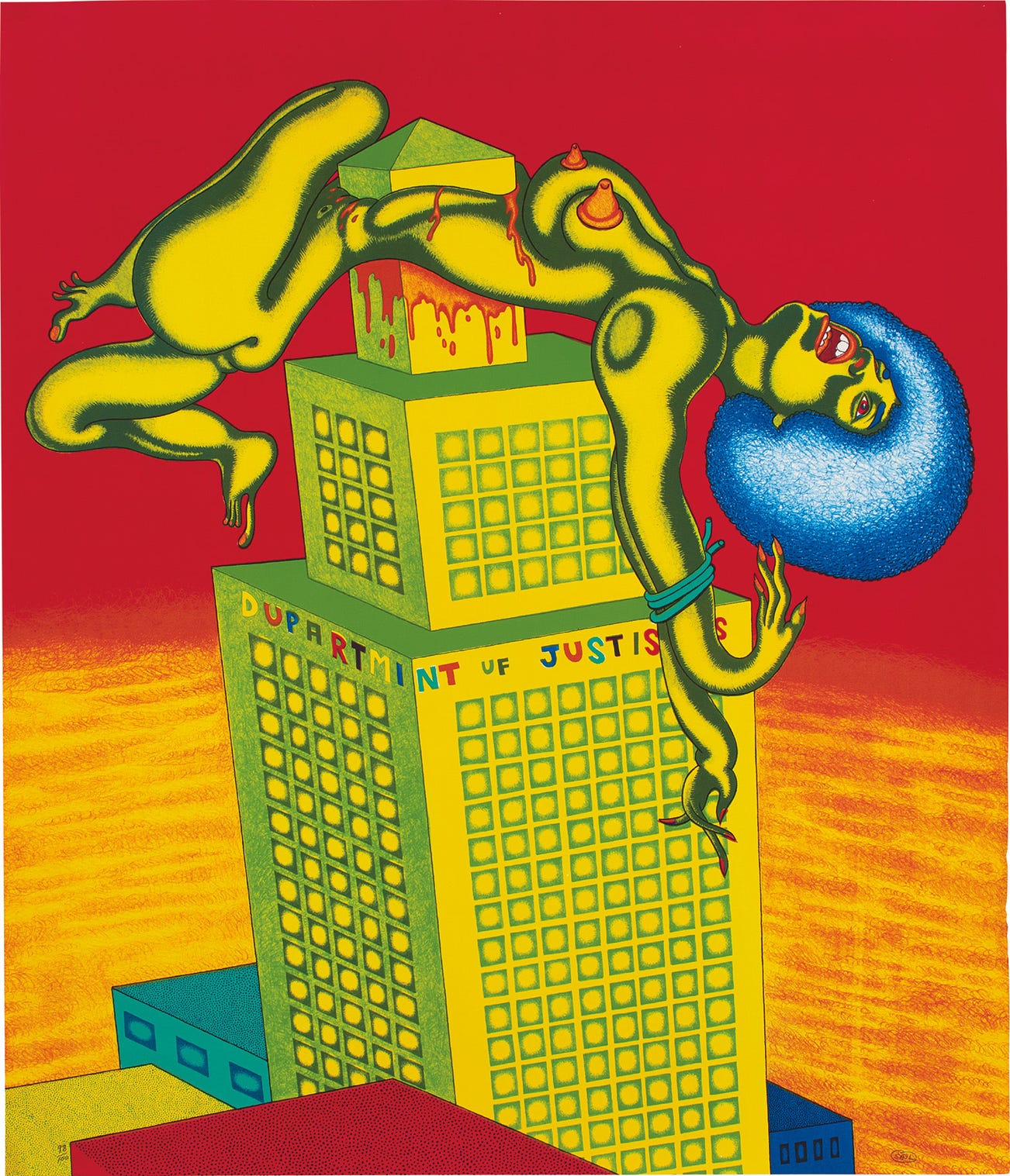 Amboosh is arguably Peter Saul's greatest print, Angela Davis is not far behind. His virtuosity as a painter, draughtsman, and image-maker is immediately apparent. Seducing the viewer to look more and look longer. His virtuosity as a storyteller is deceptive.