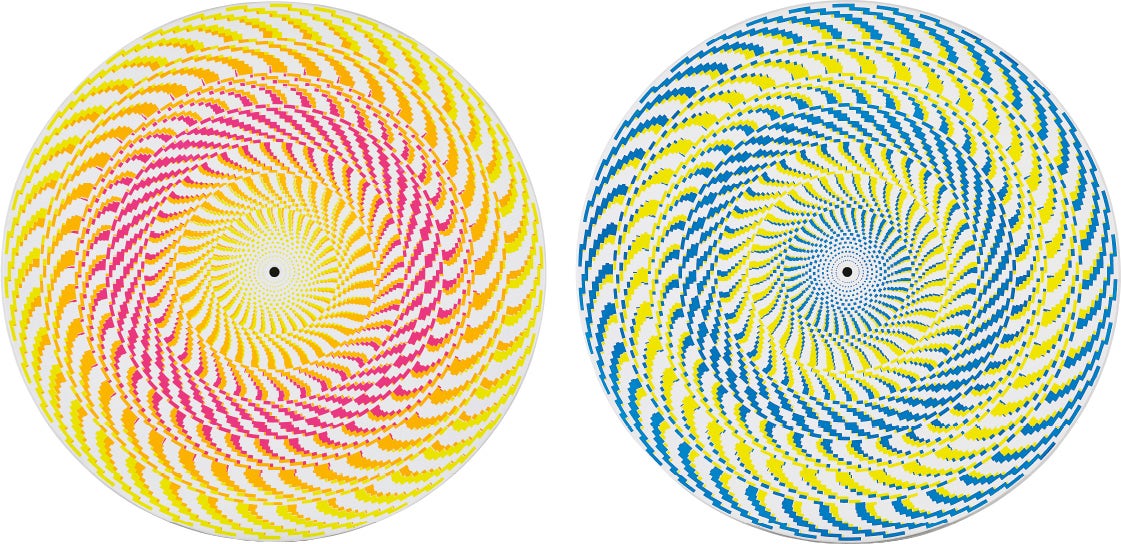 The complete set of six kinetic screenprints, in fluorescent colours, on spun aluminium.