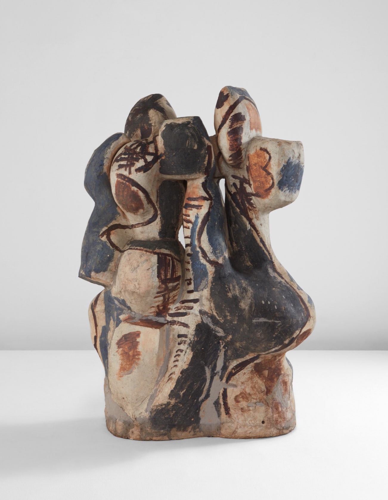 Rondena is different, more puzzle-like in its composition and less ominous. The buff-colored clay, reinforced with particulate “grog” for strength, is the same used in Voulkos’s black sculptures, but it is left partly uncovered. Three different slips - a cobalt blue, a rich iron red, and a white - are painted on to the form. This is an unusual combination in Voulkos’s oeuvre, though it does have one close correlate in the smaller work Vee (also 1958, now in the Fine Art Museums of San Francisco). When he did use polychrome in this period, he typically preferred black, blue and gray - a palette that perhaps was inspired by Cubism.