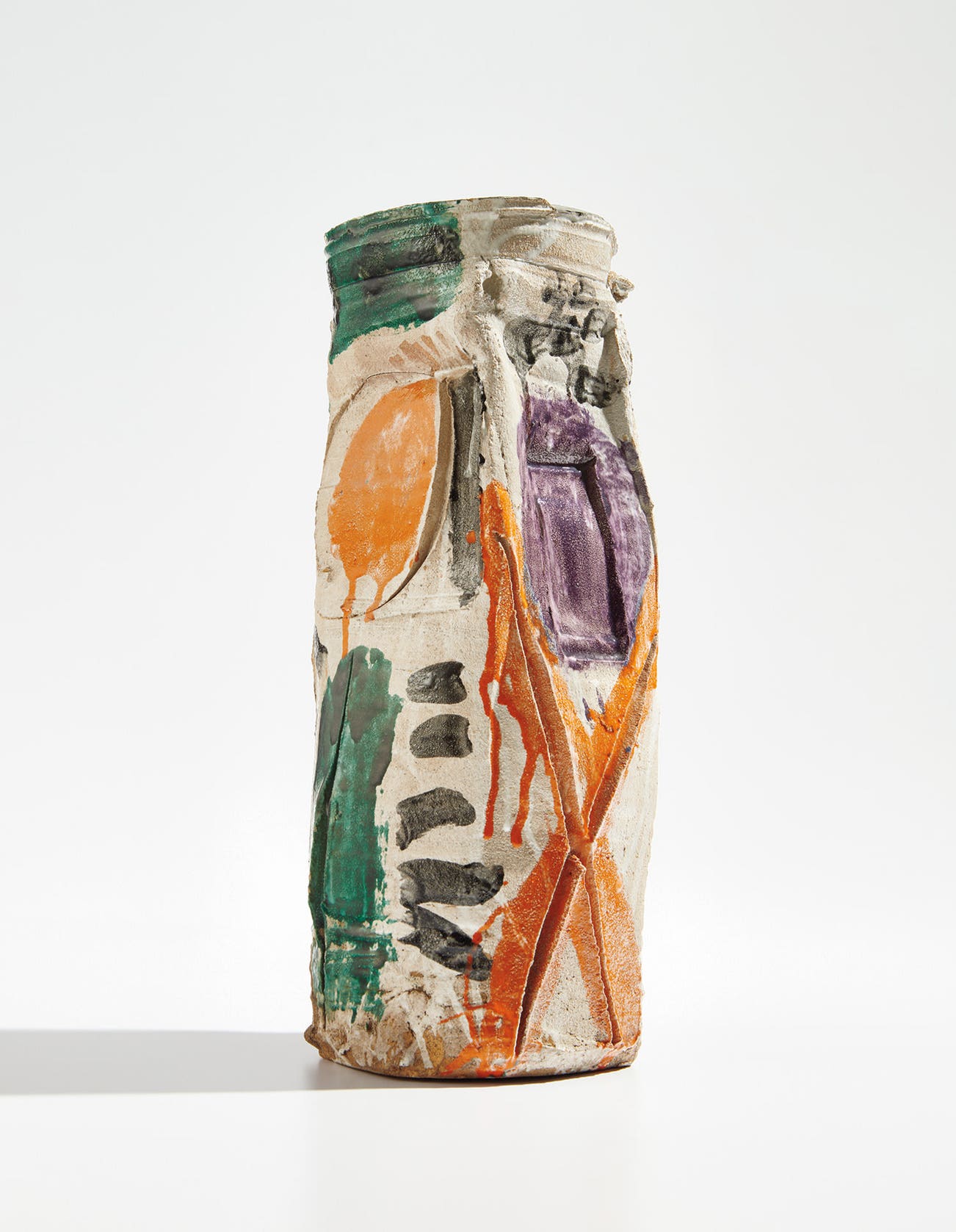 Compared to the other works that Voulkos was realizing at this time, the Untitled Vase made in Portland is relatively modest in scale, just under twenty inches in height (Cross is thirty inches high, while Sitting Bull is nearly six feet tall). Yet it possesses, in compressed form, many of the key qualities of the artist’s breakthrough. First and most obviously, it is vividly polychrome. Just at this time, Voulkos had begun to experiment with brightly colored low-fire glazes, which ordinarily would not be applied to a stoneware body. He also occasionally added epoxy-based paint to his works, as in an Untitled plate also from 1959 (Milwaukee Art Museum), the great rocket-shaped Red River (1960, Whitney Museum of American Art), and USA 41 (1961, National Gallery of Art). Though his departure from the conventional, sedate palette of stoneware seems uncontroversial in retrospect, it was understood at the time as a statement of radicalism, and a declaration of affinity with contemporaneous Abstract Expressionism.