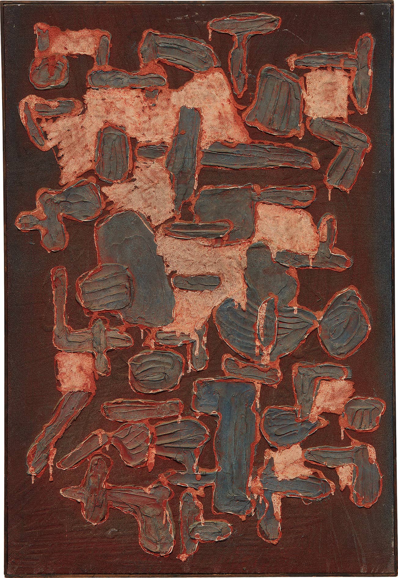 These early years—the 1950s up through 1968—are what scholar Glenn Adamson defined as Peter Voulkos’s “breakthrough years.” During this time, he was creating his most important and influential body of ceramic work, eschewing traditional forms and notions of ceramics and engaging fully and physically in the manipulation of clay into abstract sculpture. In 1958, the year the present lot was painted, Voulkos was sharing a studio in Los Angeles with fellow ceramist John Mason. The two worked closely together, experimenting with new techniques, surfaces, and working on ever larger scale sculptures, developing the necessary equipment together. From the composition and coloring of the present painting, compared with Mason’s iconic monumental Blue Wall (1959), one can surmise that Voulkos’s and Mason’s collaboration extended beyond material to concept as well.