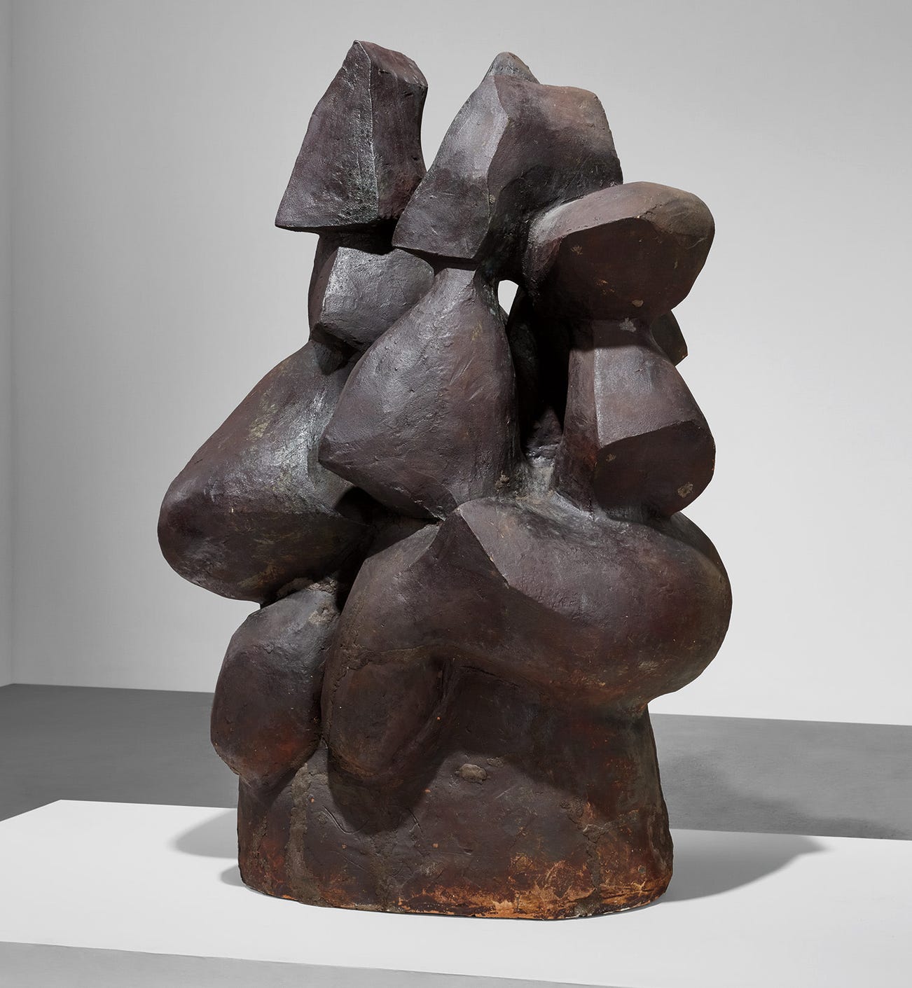 Imagine you are Peter Voulkos in 1958. Here is what is on your mind. First and always, the landscape of Montana, where you were born and raised: the sublime power of that terrain, the drama of the cragged mountains and the passes cutting through. Second, the potential of clay as a sculptural medium, which you have been thinking about constantly—not abandoning your hard-won potter’s skills, but redeploying them in wholly unconventional ways. Third, an ever-enlarging constellation of artists, among them Pablo Picasso, Fritz Wotruba, and Franz Kline, as well as the more immediate energies of the Los Angeles scene (notably, the gang at the experimental Ferus Gallery, now in its first year of programming). Fourth, the new possibilities of scale afforded by your new Glendale Boulevard studio, with its oversized kilns, which you share with a fellow artist, John Mason. The architectonic quality of Mason’s work is itself a fifth element—a level of ambition for you to match, blow for blow.