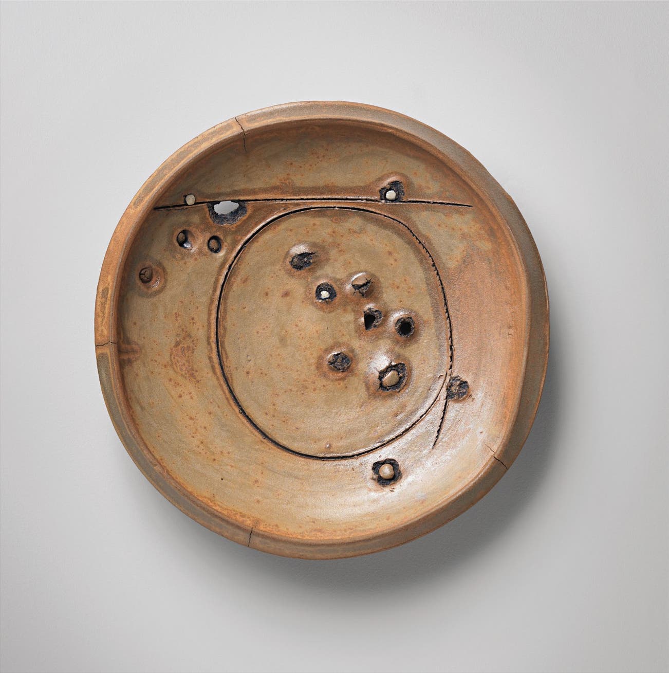 Gas-fired wheel-thrown and manipulated stoneware with porcelain pass-throughs, drawing and punctures with cobalt slip/oxide and clear glaze.