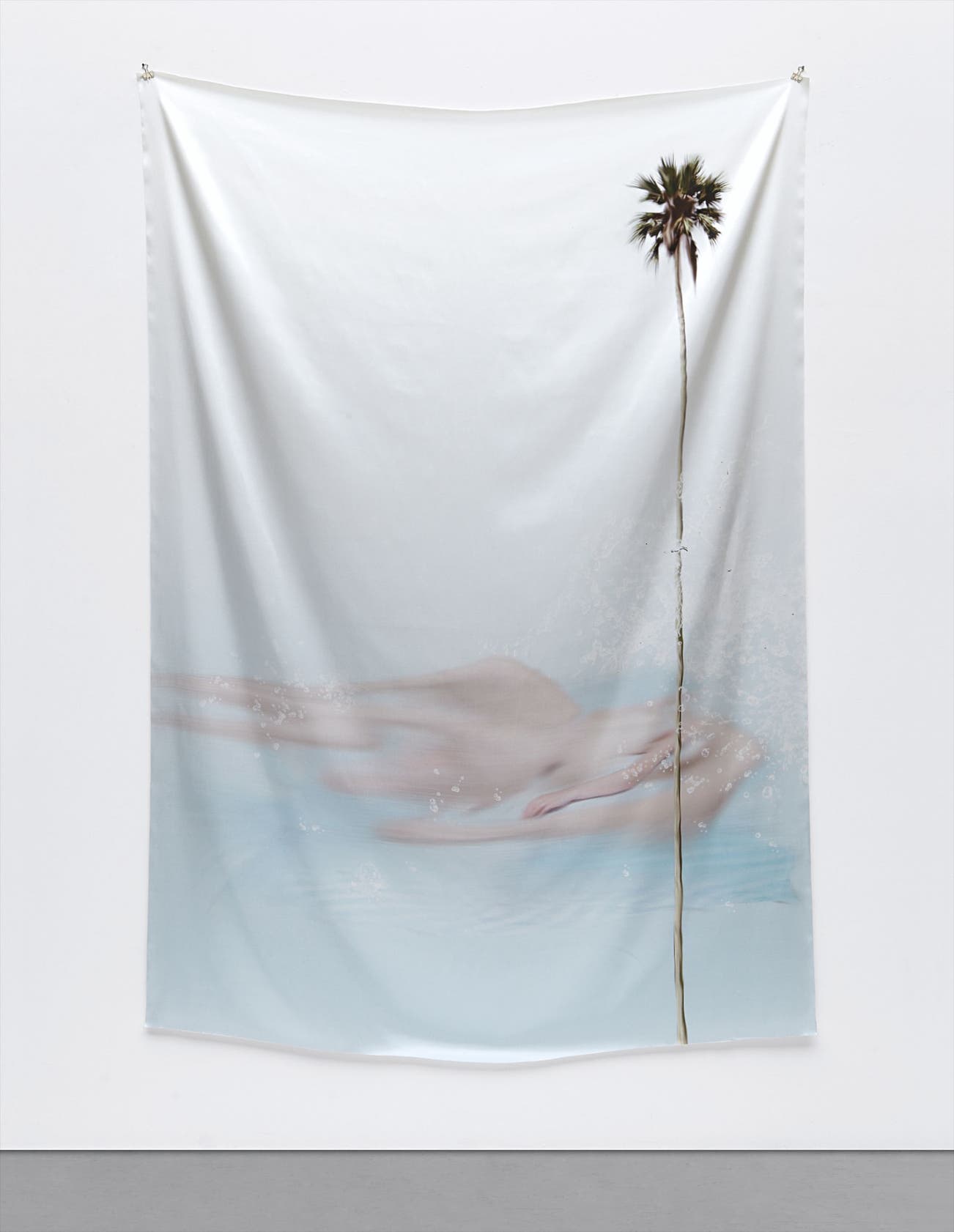 The present lot, Untitled, 2011, is a digital painting on satin. The qualities of this chosen medium allow for it to be hung slack from its top corners. The soft, translucent strokes of the painting billow across the fabric in ways that reflect the qualities of the material itself as well as its pictorial content. The depicted palm tree represents movement in the swaying leaves and this dynamism is also portrayed in the cloudlike formations loosely depicted in the lower central section of the piece. Cortright’s work seems to reflect ease and consequence in both concept and technique: ‘my stuff is so flexible’, and thus, in her adaptability, successfully manages to merge technology with individual, artistic inspiration.