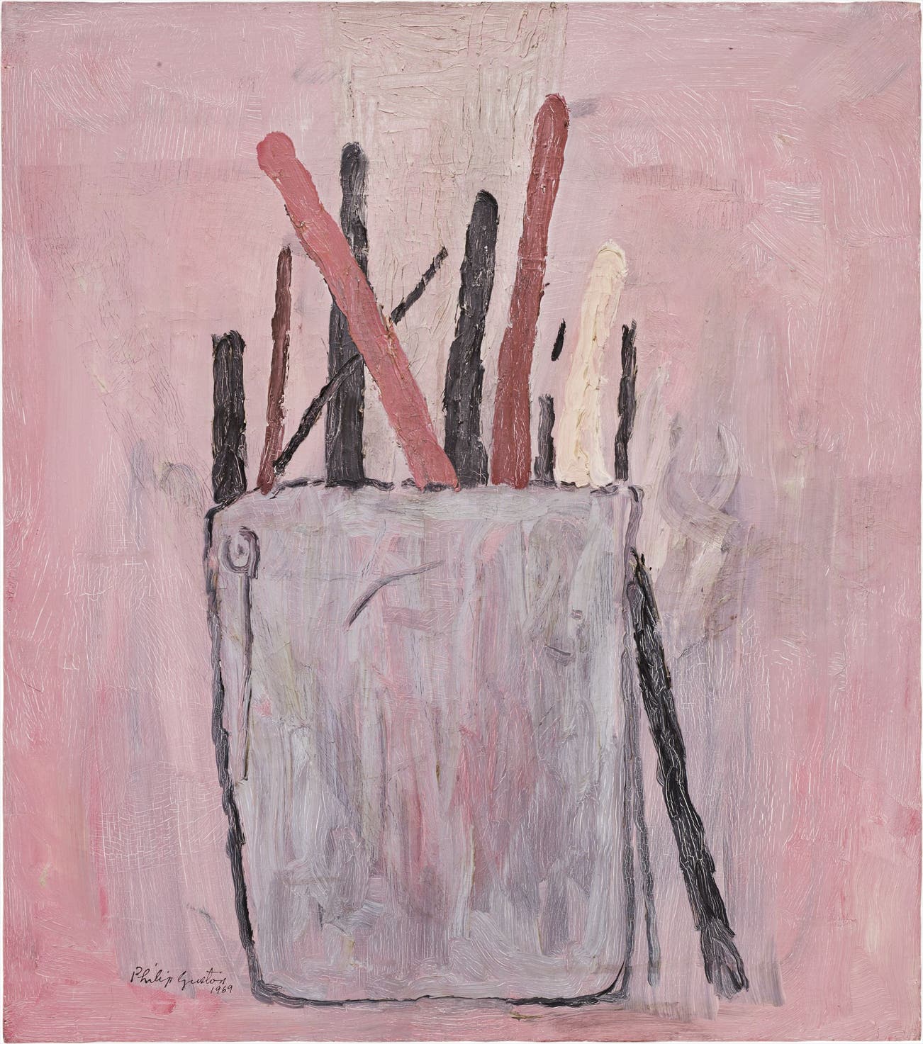 The present lot is a touching reintroduction of the figure into Guston’s work. As one of the first works of neo-expressionism in the Western canon, it is difficult to understate the influential power of Brushes, 1969. Humbly portrayed in their light brown satchel, Guston’s brushes follows hearkens back to the traditional still life of the Impressionists, whose use of materials within the studio served as an equally effective alternative to the domestic still life of various foods and books arranged for the painter’s eye. Jutting out both straight and angled, Guston’s brushes range in their colors from cream on the right to bright red and even to sinister tones of black and siena. These various makes of brushes are a testament to Guston’s many years as a painter, each a representative of a different era in his work.
