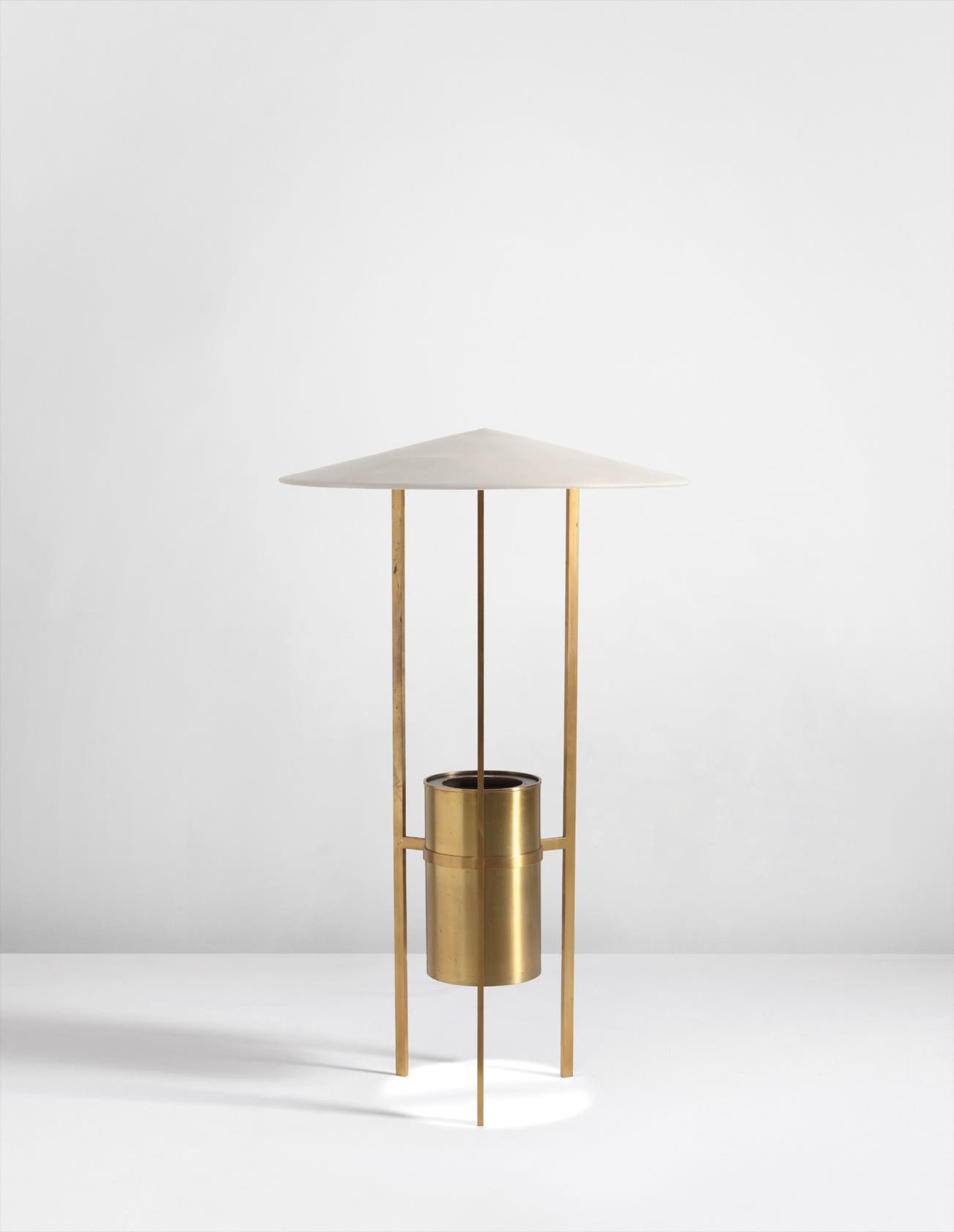 The present model was designed by Richard Kelly for Philip Johnson's Glass House in New Canaan, Connecticut. Presented with the challenge of lighting a glass-walled space, Kelly developed a lamp to minimise glare and reflections. His solution was constructed from a bulb hidden in a canister lined with fins (an idea lifted from theatrical lighting), a shallow conical shade to diffuse the light that emanated from the base and one of the first dimmer cords to be found in a residential setting. The result was a lamp form truly derived from its intended function. The present lot, from the 5th Avenue apartment of William A.M. Burden, is an example of the original three-leg design used in Johnson's residential projects of the early 1950s, of which there are less than ten known extant examples. The model that was commercially available through the late 1960s had a fourth leg.