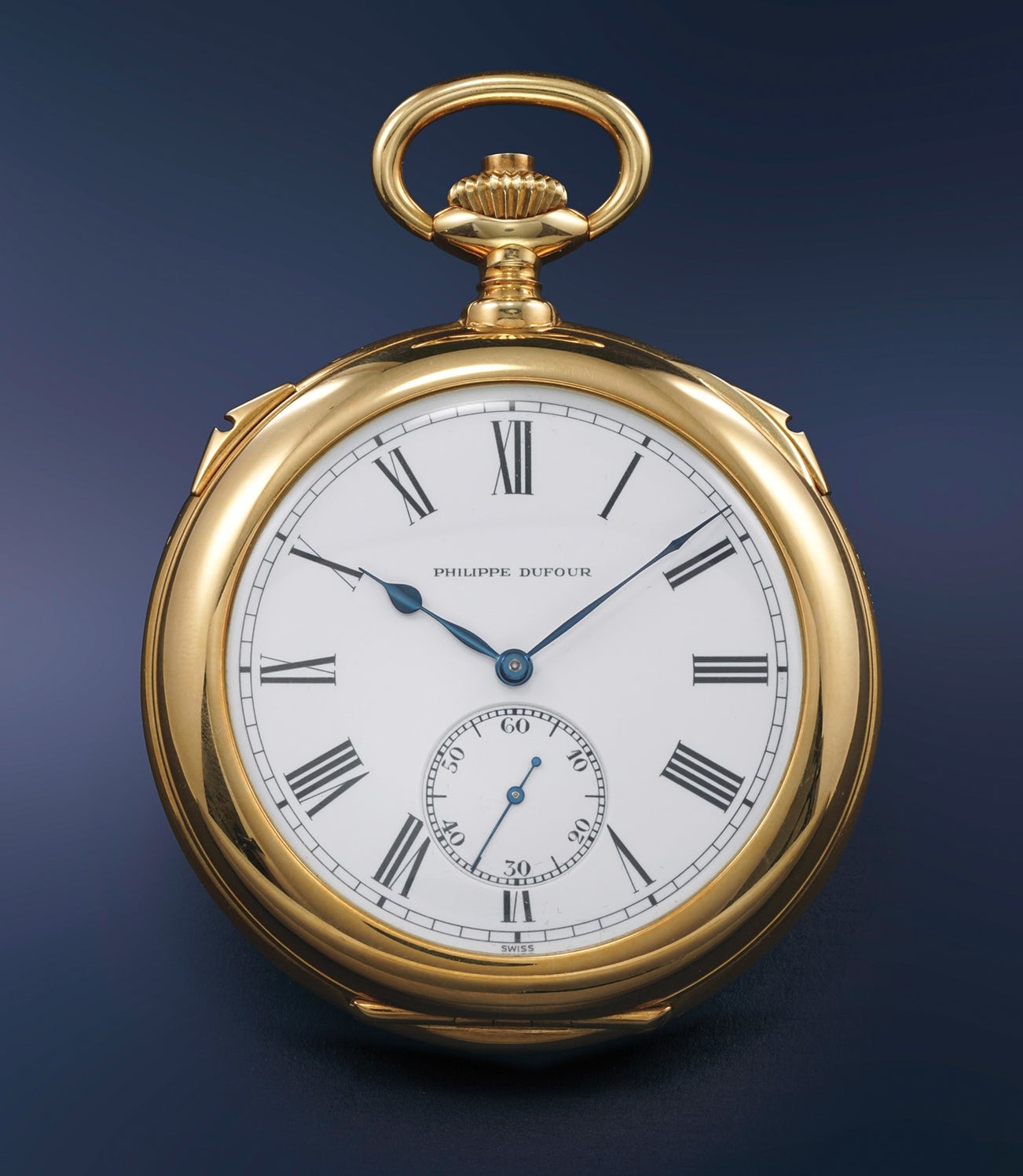 The present watch, fresh to the auction market, went to a prominent collection upon completion where it remained, and as such, there are even very few photographs of it. Bearing number 1 and being the only Grande & Petite Sonnerie pocketwatch ever made by Philippe Dufour, it remains unique and a tribute to his incomparable talent.
