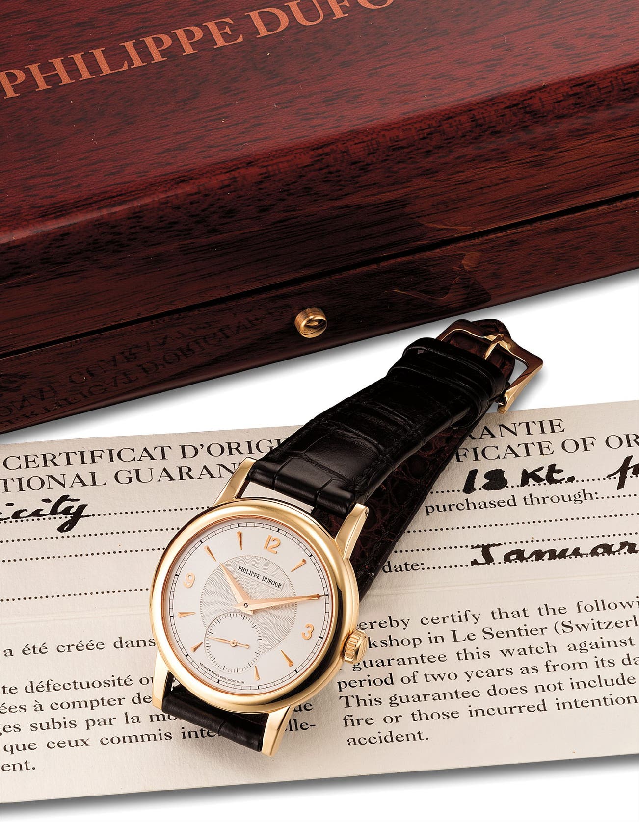 The present example features the 37mm case in pink gold, and the guilloche dial. In excellent condition and complete with original presentation box and certificate, this is a rare opportunity to own of the most sought after modern watches of the 21st century. Very few examples have appeared at auction, however it was Phillips' honour to offer two Simplicity models in Hong Kong in 2016, and setting an auction record of 2 million Hong Kong Dollars for a 37mm rose gold model.