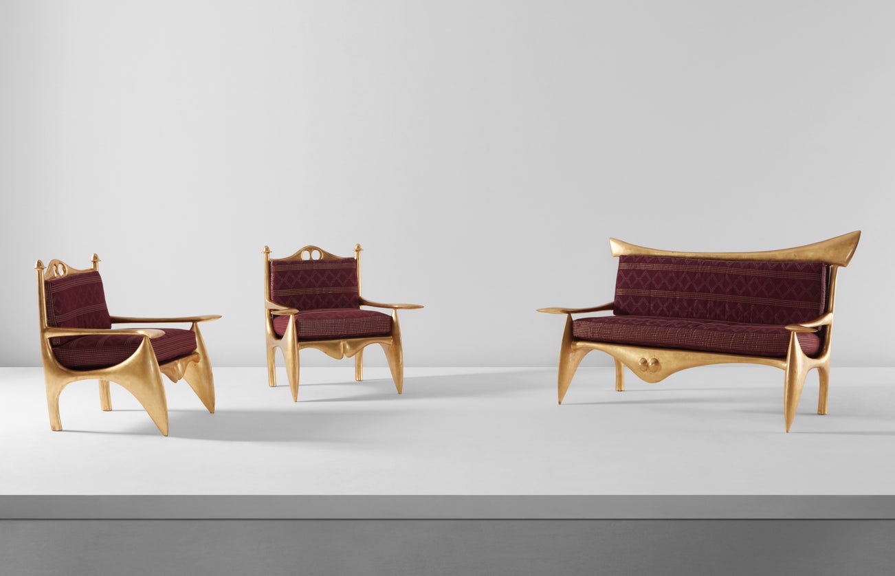 Édition Galerie Patrice Trigano, Paris, France. The canapé from the production of 50 and the armchairs from the production of 50. Back leg of each incised Hiquily.