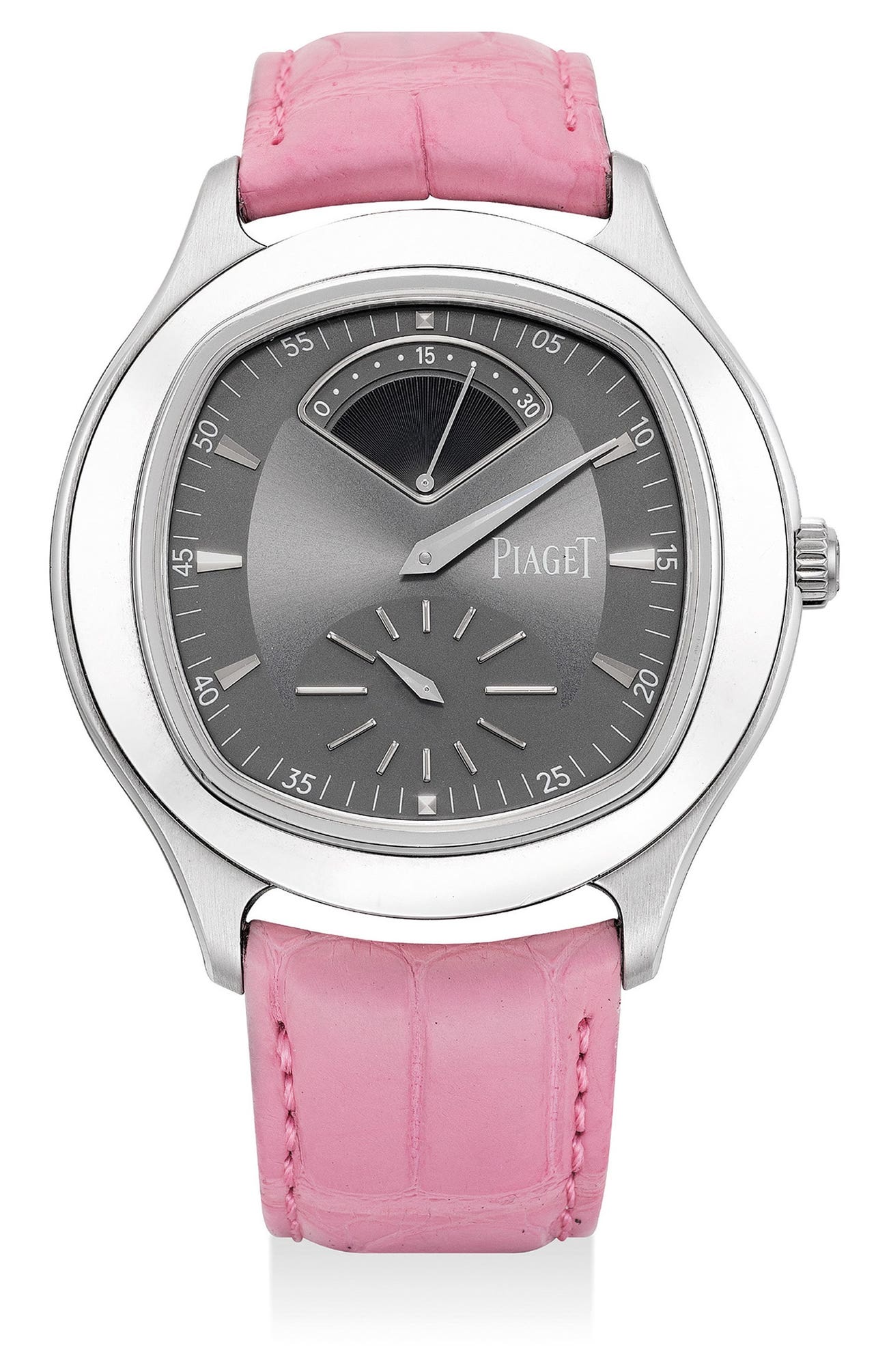 A fine and attractive limited edition white gold cushion-shaped wristwatch with retrograde seconds, regulator, large central minutes and hours at 6 O’clock, numbered 011 out of a limited edition of 100 pieces
