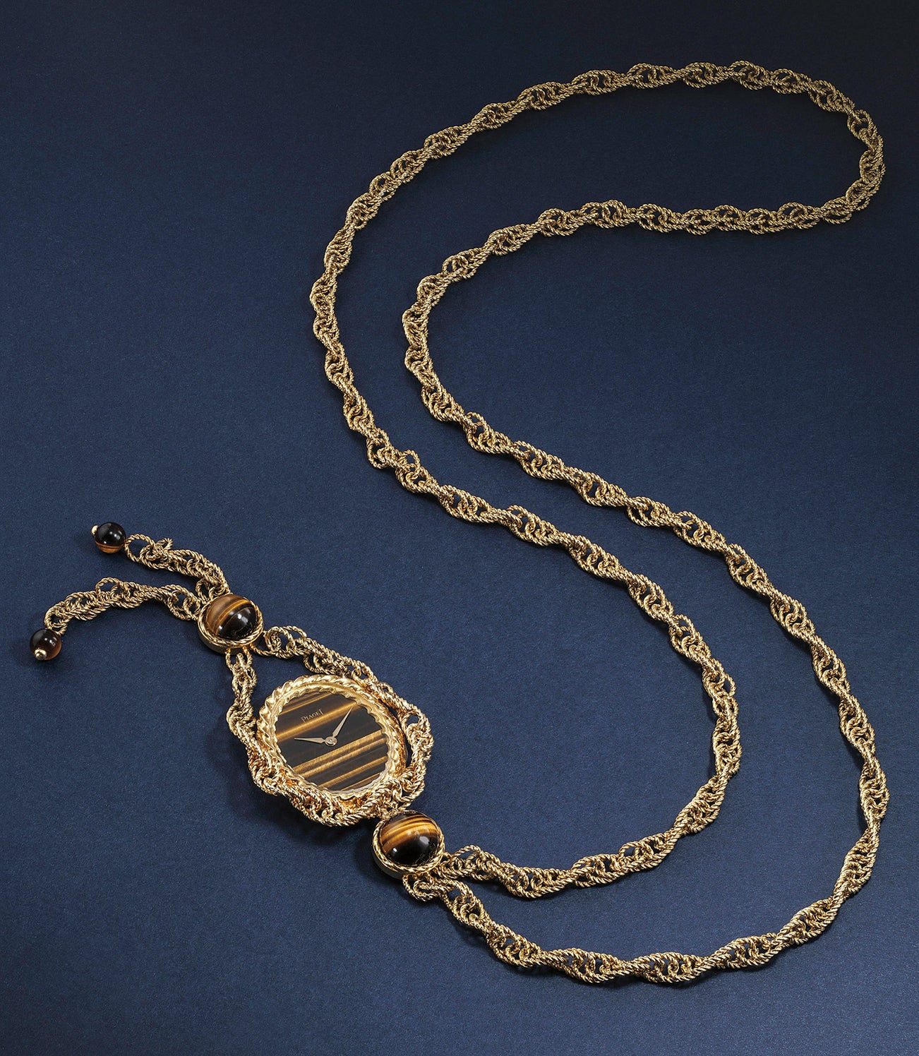 The present example is a superb representation of Piaget’s extravagance. This versatile pendant watch is adorned with a silky and lustrous tiger’s eye dial and cabochons on the chain, and is fitting for any chic and elegant event.