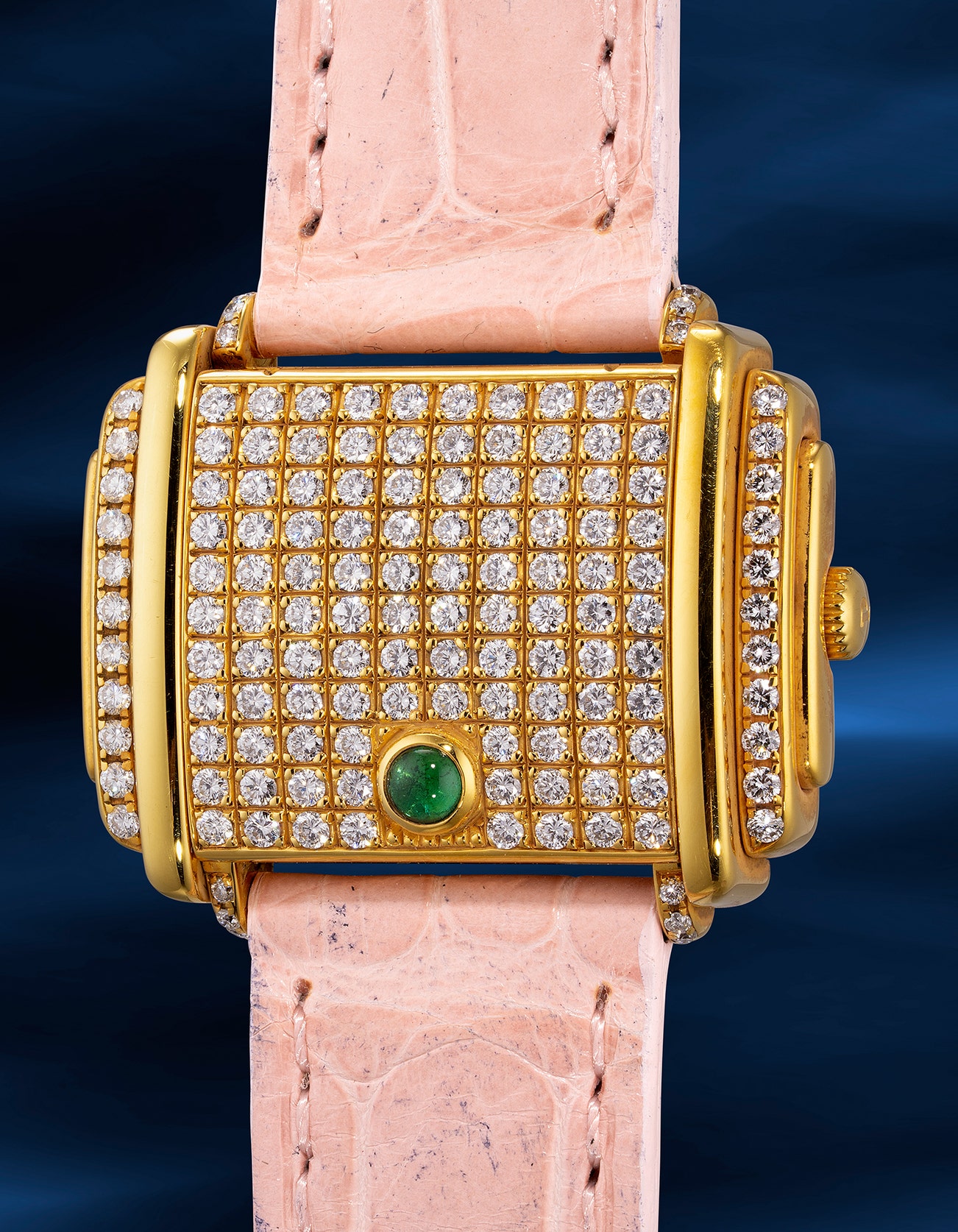 - This resplendent example features dazzling pavé diamonds and an emerald jewel on the yellow gold case, a treasure sure to delight jewelry aficionados. Yet a hinged cover reveals the dual nature of Piaget's craft: an elegant mother of pearl dial that marries luxury with precision.