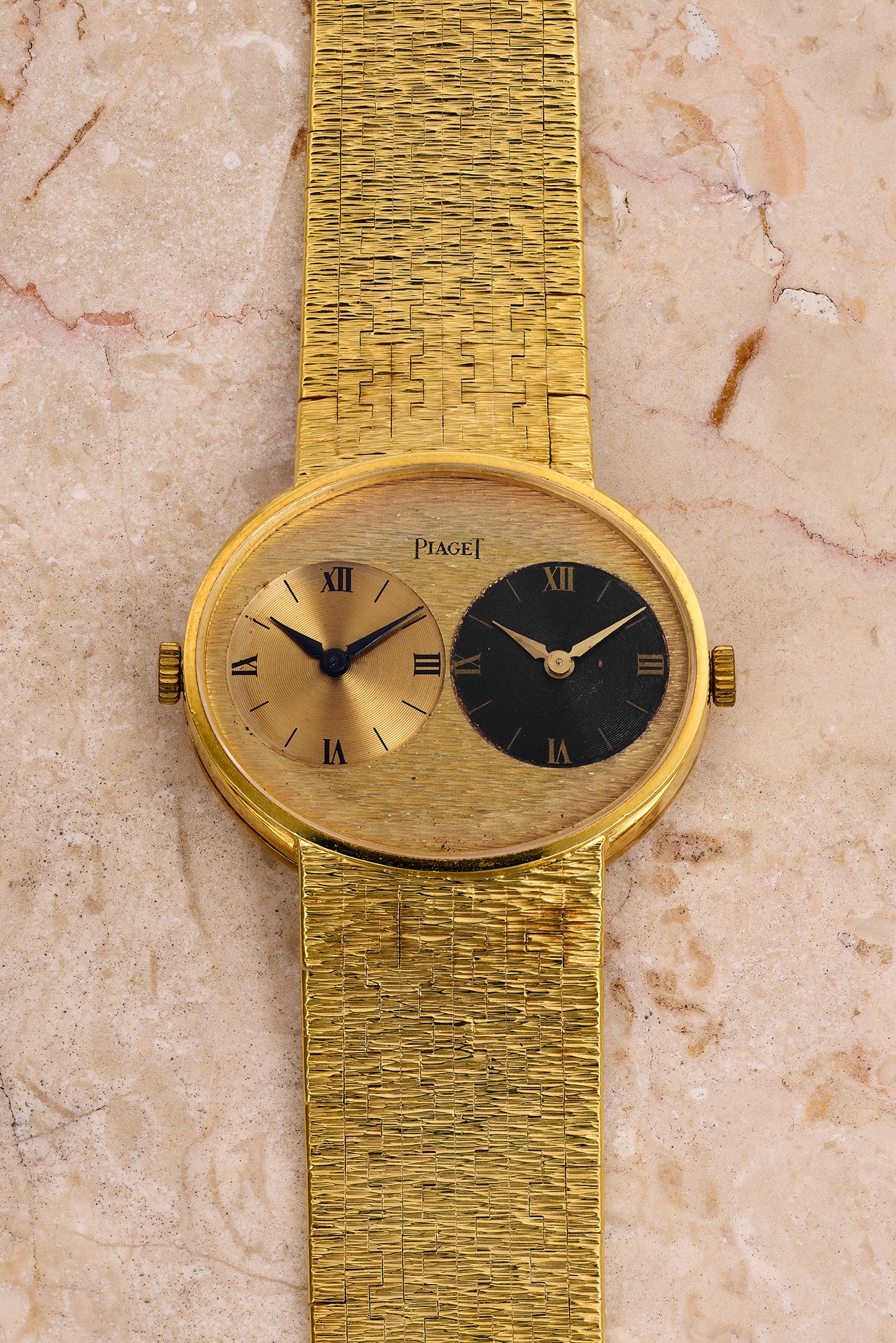 --The present dual time bracelet watch is a wonderful representation of this audacious era. The elliptical yellow gold case houses two individual Piaget caliber 6P1 movements, with the dual time zones featuring gilt and black subsidiary dials respectively. The watch is further enhanced with the bark finish linked bracelet.