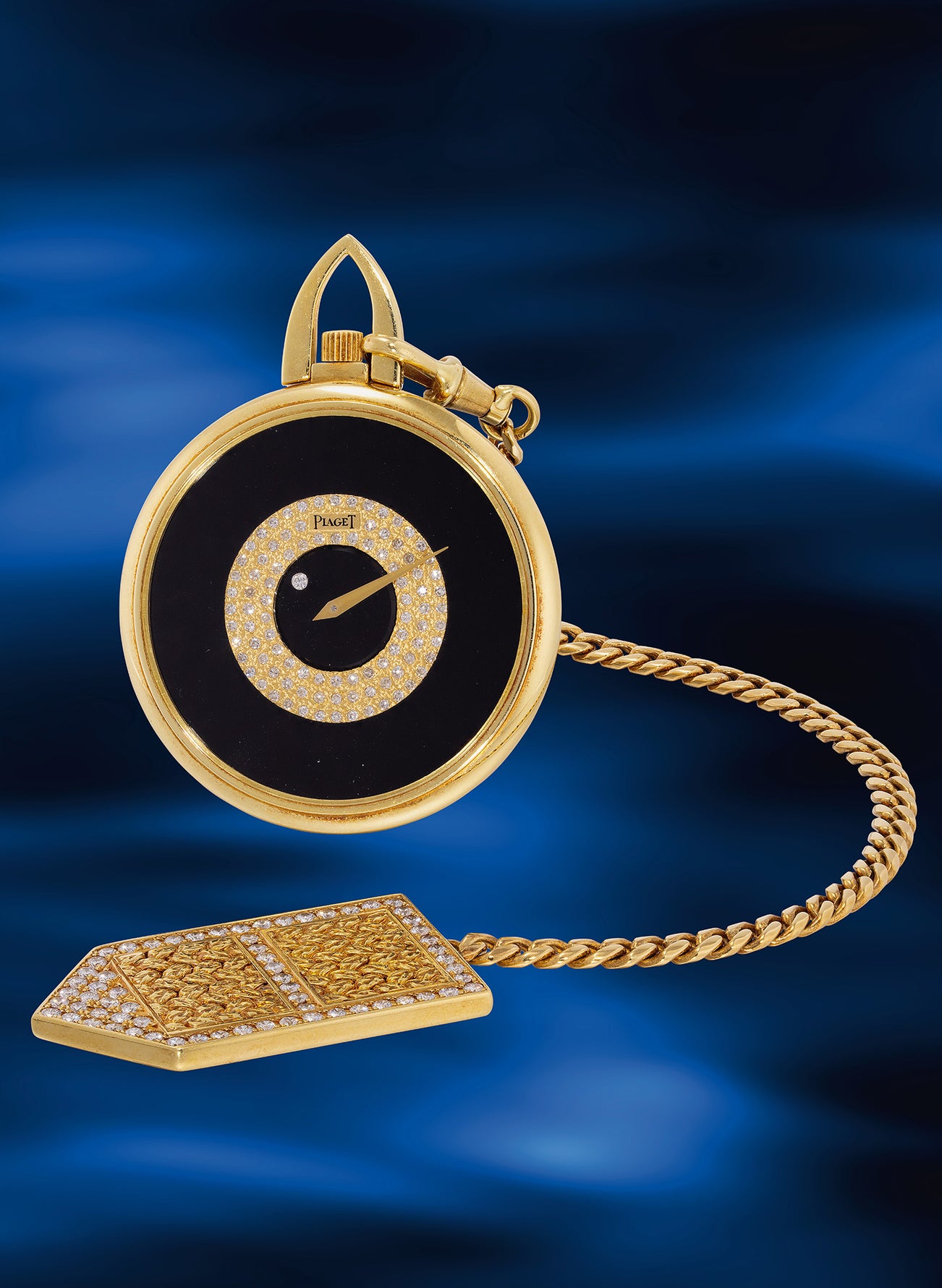 Extremely well-preserved from the era is the present yellow gold pocket watch sized at 38mm diameter. Paired with a minimalistic bullseye appeal thanks to the rich black onyx contrasting to the warmth of yellow gold, three rings of diamonds encircles a subtle feature of this timepiece. Indicating the hour with a single diamond with one minute hand, this is a highly rare mystery pocket watch from the 70s. While such design are seen mostly on wristwatches with integrated bracelet, only a handful of mystery pocket watch with stone dials have surfaced in the market.