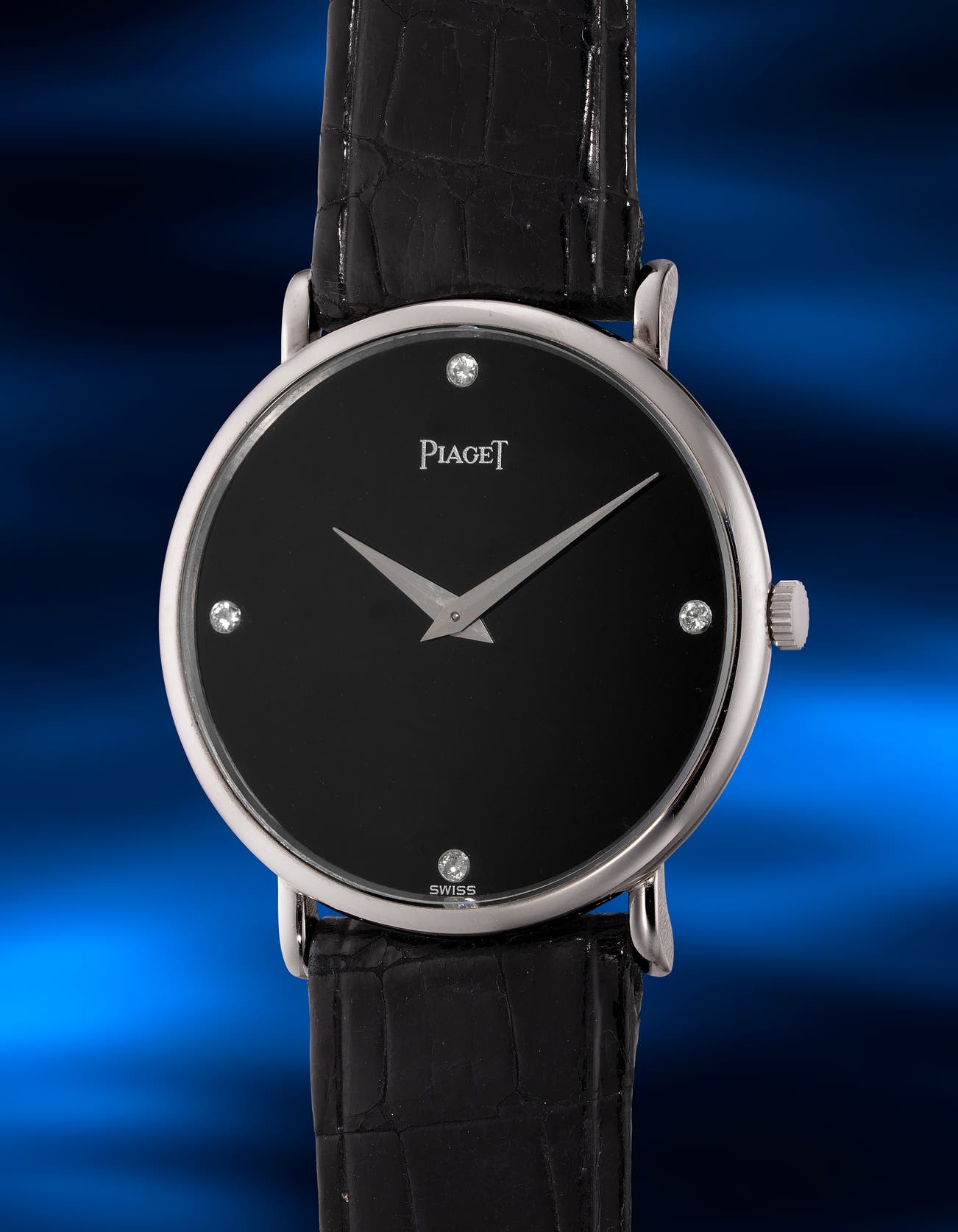 - The present white gold timepiece from the Altiplano collection is distinguished by a luxury elegance of an onyx dial with decorative diamond-indexes to mark the hours.