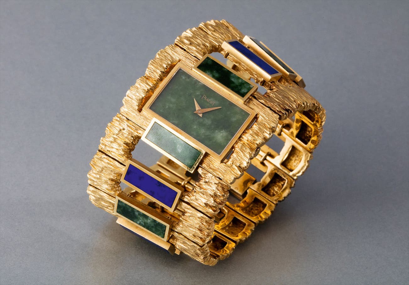 Collectors consider the 1970s as Piaget's era of superb creativity and unbounded designs. During this highly creative period, the brand designed an impressive range of cuff and bracelet watches carved in gold and adorned with exotic hard stones. Admired by most as not only jewelry but also true works of art, the firm's hard stone dial watches remain the most iconic, recognizable and desirable among collectors.