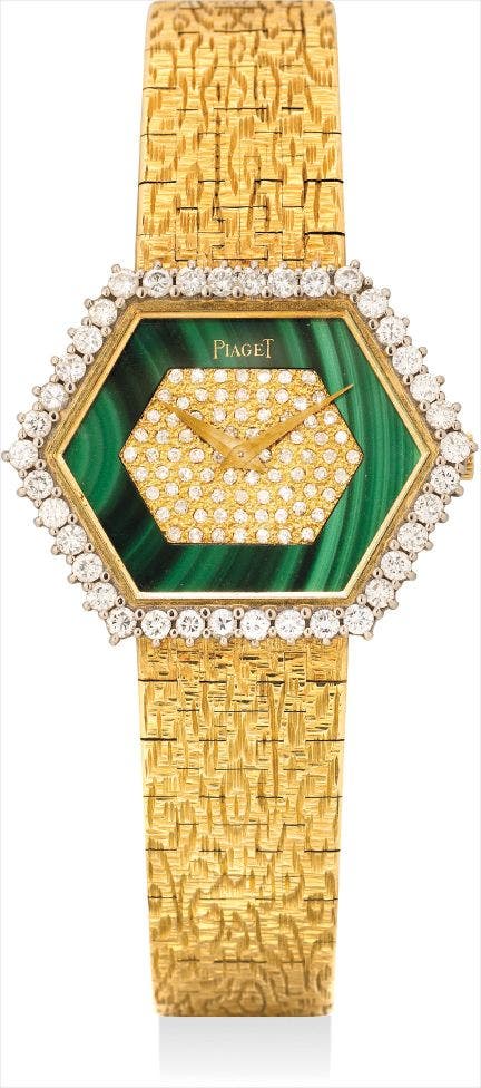 A rare yellow gold and diamond-set hexagonal bracelet watch with malachite dial