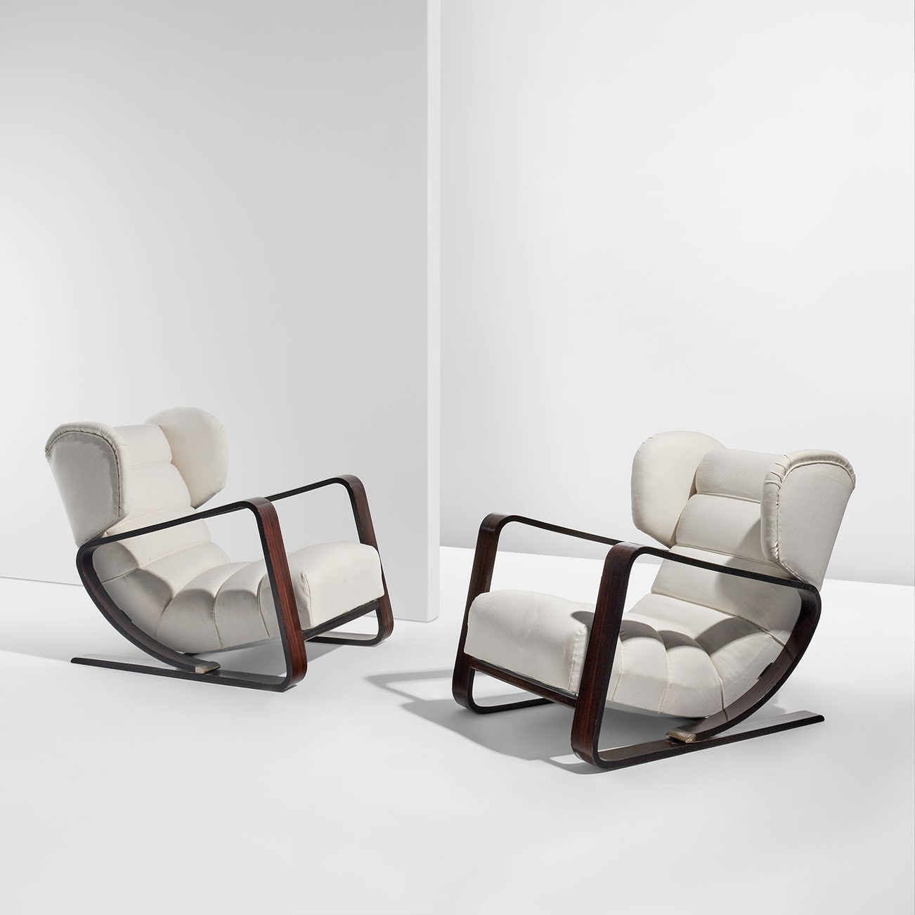 Macassar ebony-veneered wood, fabric upholstery, steel.