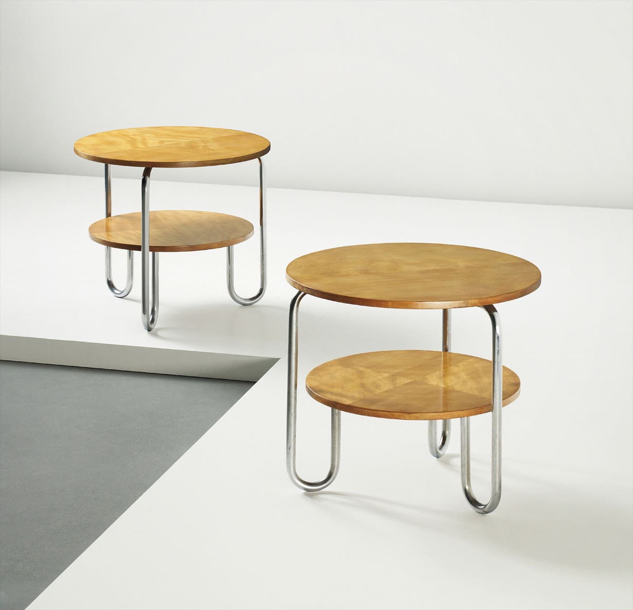 Chromium-plated tubular metal, beechwood-veneered wood.