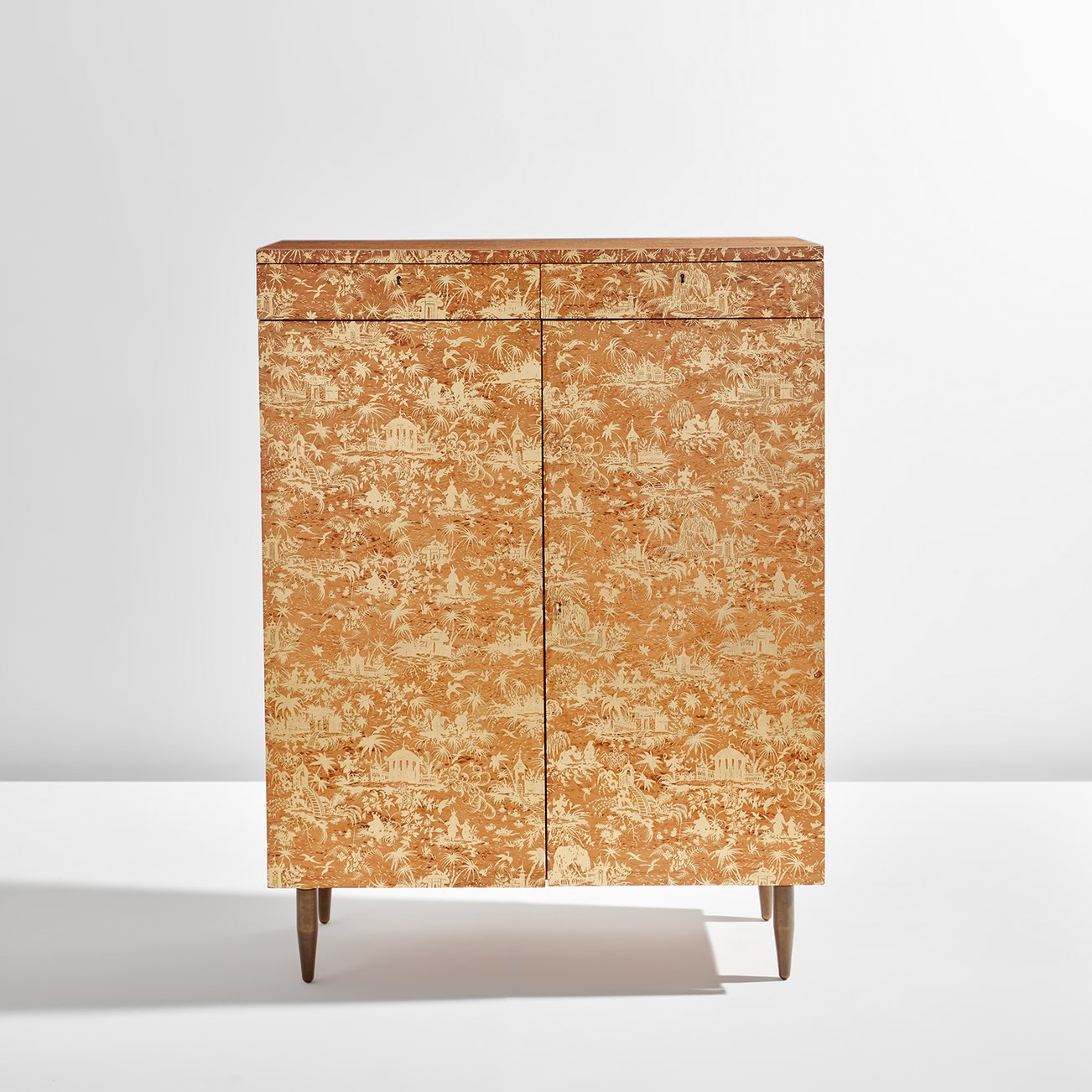 Burl walnut-veneered wood with applied gold leaf, brass.