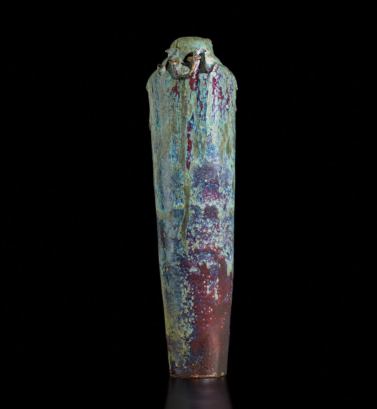 Stoneware with high and low-fired copper-oxide glazes.