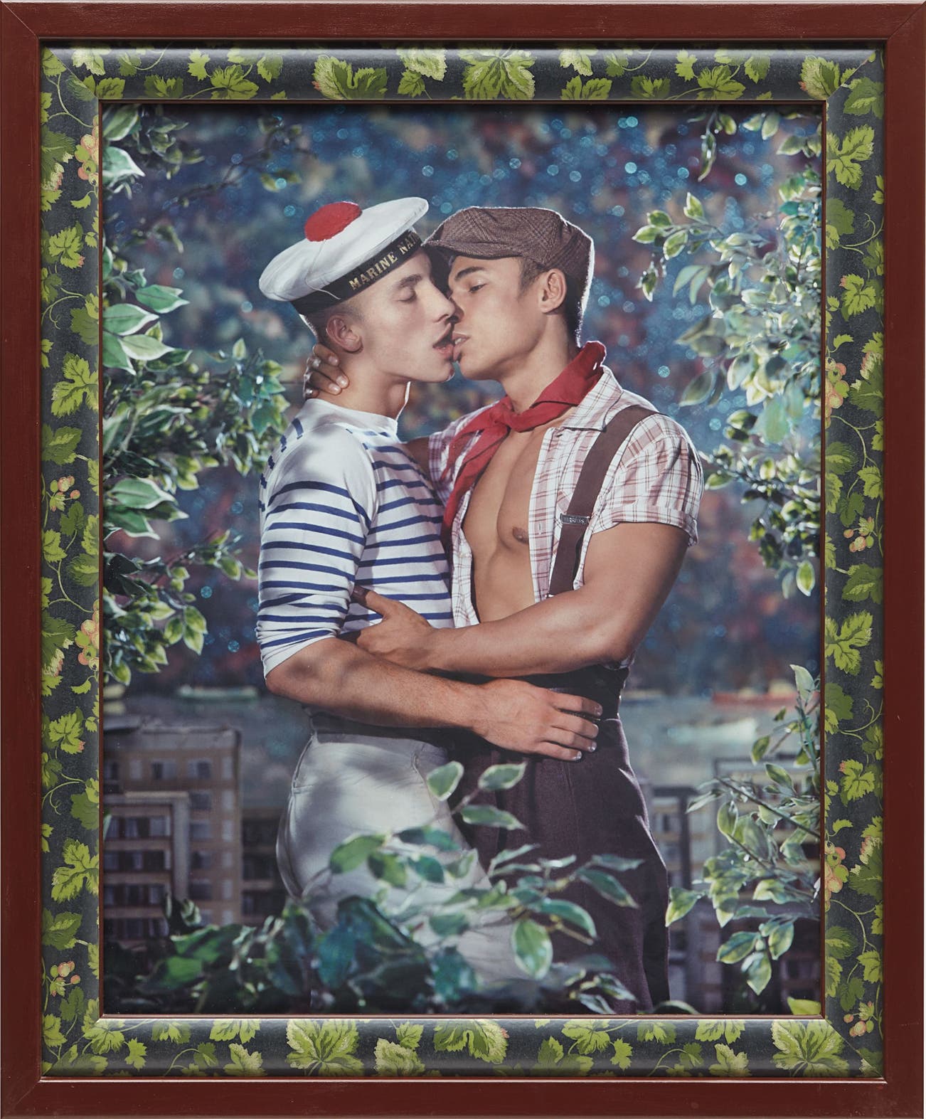 In Les amoureux, the artists depict a loving gay couple amidst a romantic, leafy setting. The foliage framing the image and the print creates a scene of natural immediacy, as if stumbling into the couple by accident during an outdoors stroll. In doing so, the artists understate the staging of the photograph, aligning it with the honesty of candid snapshots. As such, the artists seem to hint that the couple’s love is not artificial, but a natural occurrence. Moreover, each man appears to be modeled after a quintessential type of French masculinity: one is a sailor, the other an artist. In joining the two prototypes, Pierre and Gilles do not subvert notions of French masculinity as much as enhance them. Manhood, in their world, is not defined in relation to women but by the freedom to love. Similarly, the work is not homoerotic since it does not intend to insinuate affection but rather proudly proclaim the simple wish to openly love. Taken in 1998, the image predates the legalization of gay marriage in France by fifteen years, and continues to echo support for equal rights and universal love.