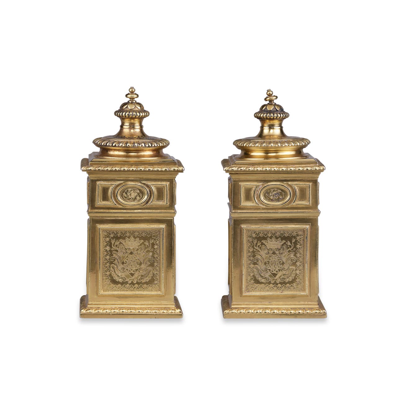 Each flask square-shaped, the stepped sides with diagonal gadrooning, each face engraved with an interlaced monogram within a lozenge surmounted by a marquis's coronet and enclosed within a reeded frame, echoed in the upper section with a rosette, the upper element unscrews and serves as a stopper, measuring approximately 170 x 67mm, British hallmarks and maker's mark for Pierre Harache.