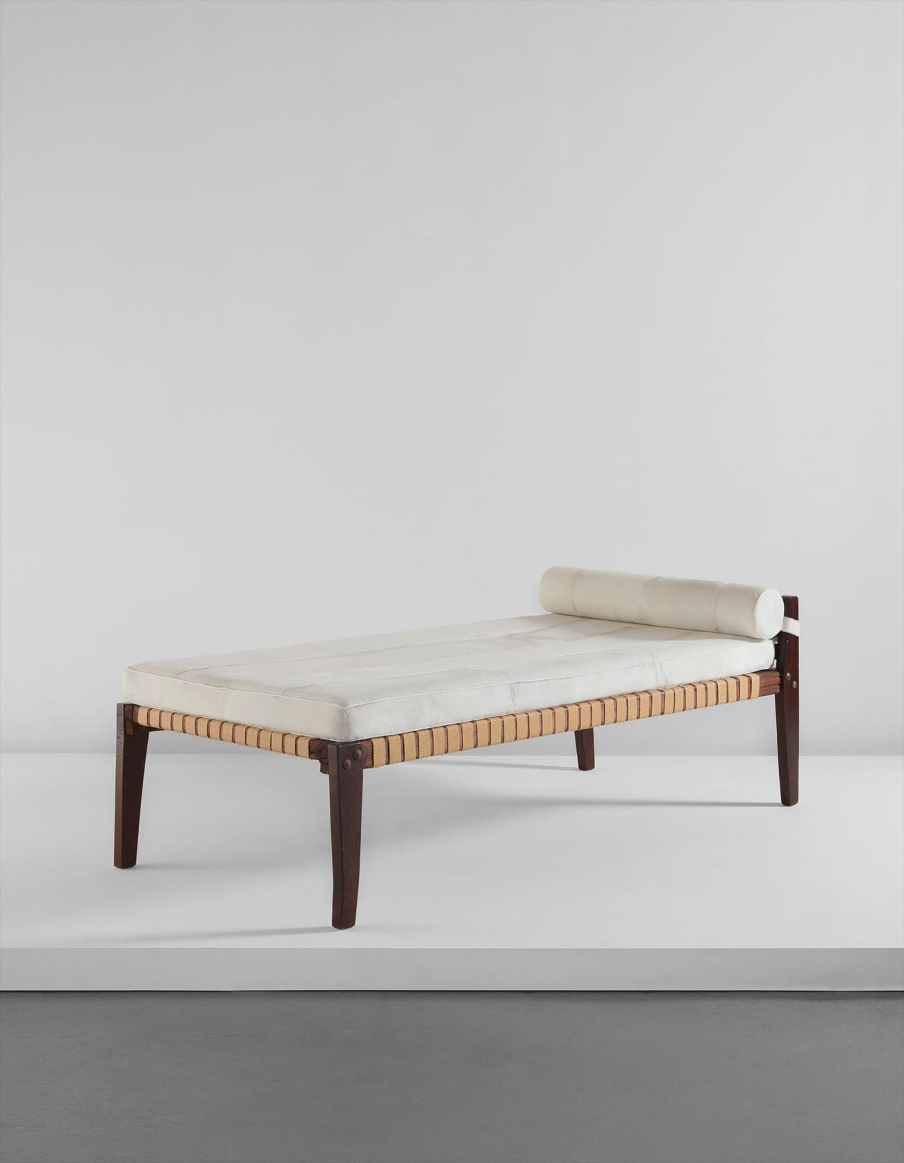Teak, hide, webbing.