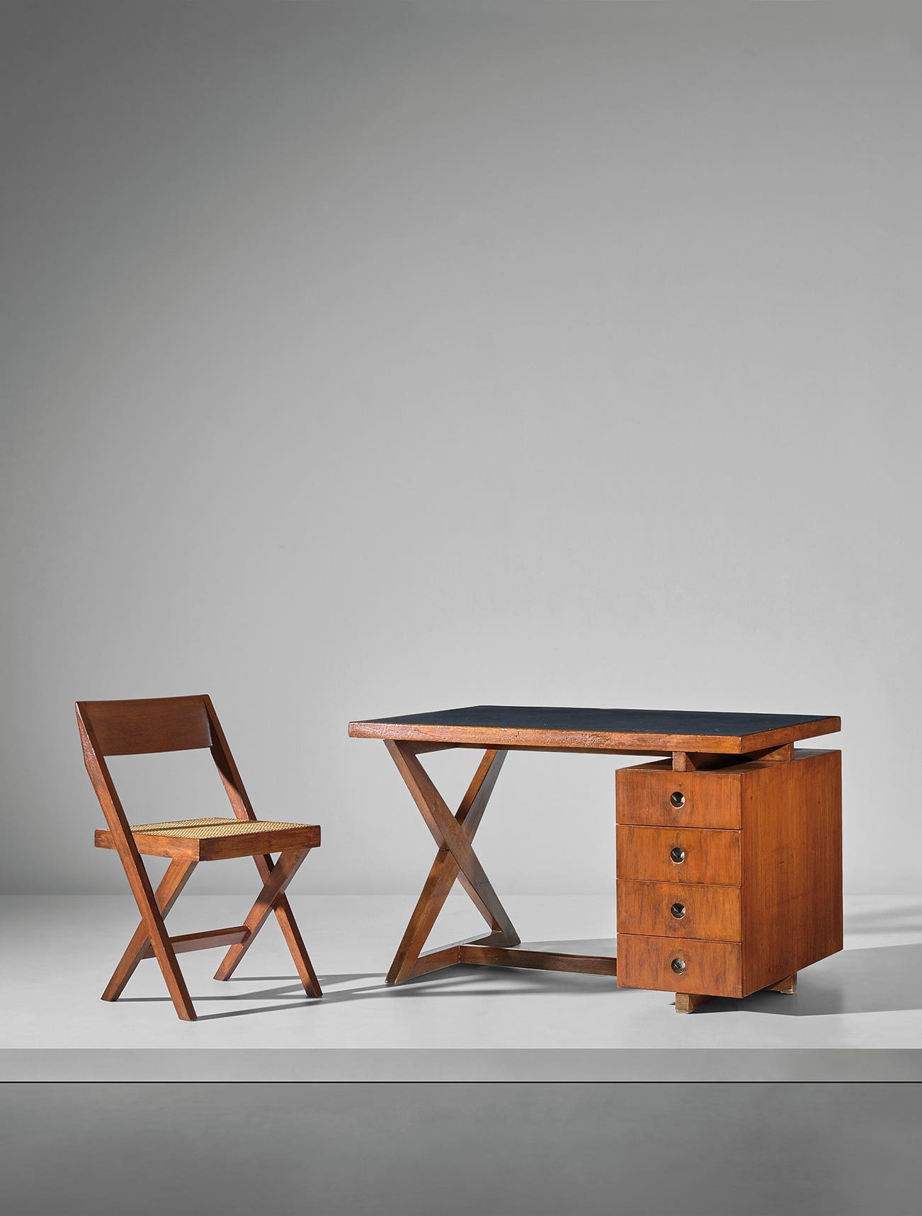 Together with a 'cane seat wood back' chair, model no. PJ-SI-51-A, designed by Pierre Jeanneret and Eulie Chowdury for the High Court, Punjab University Library, Chandigarh.