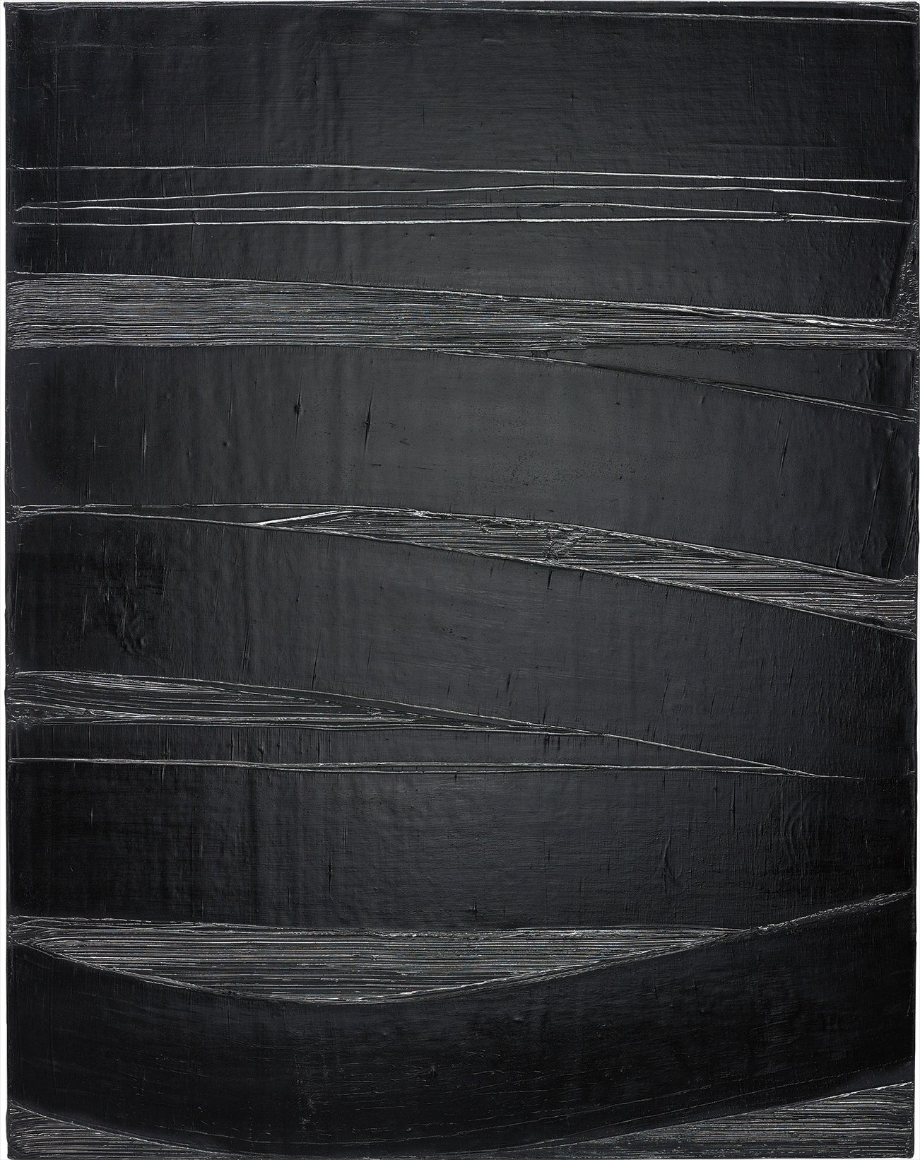 Painted in 1980, during the early stages of Pierre Soulages Outrenoir’ works, Peinture 130 x 102 cm, 14 Octobre 1980 is exemplary of his experimentative series. Thick, textural layers of black paint consume the entirety of the canvas, the directional impressions and undulations of impasto presenting a sculptural surface upon which the ridges and ruts reflect the light. The artist’s sculptural composition reveals an iridescent luminosity, akin to a window glistening in the sun. Soulages' monolithic works, built up with an array of industrial tools, are titled in accordance with his strict, methodical formula: Peinture, measurement, date.