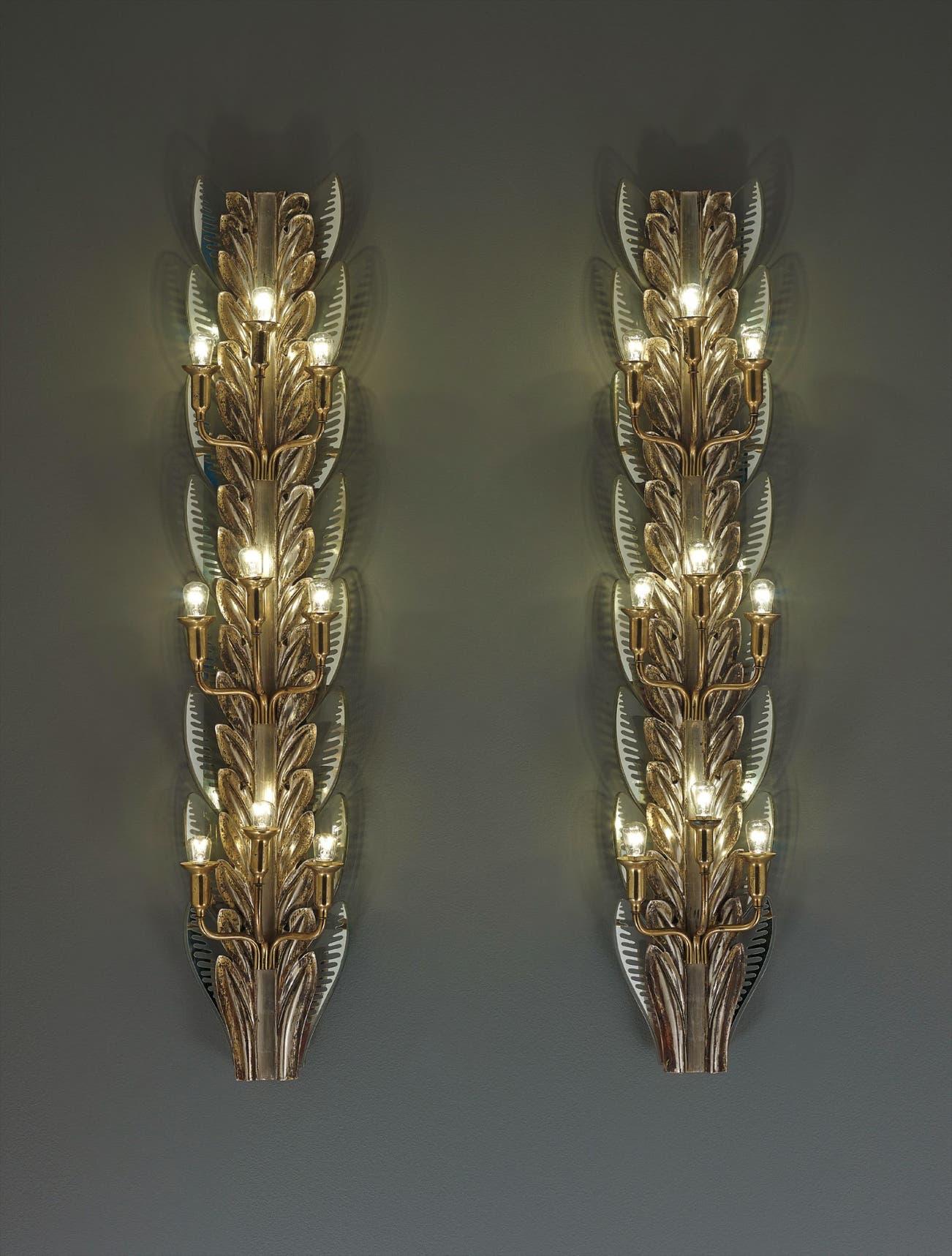Partially-mirrored glass, gilt and silvered wood, brass, original fabric shades (not illustrated).