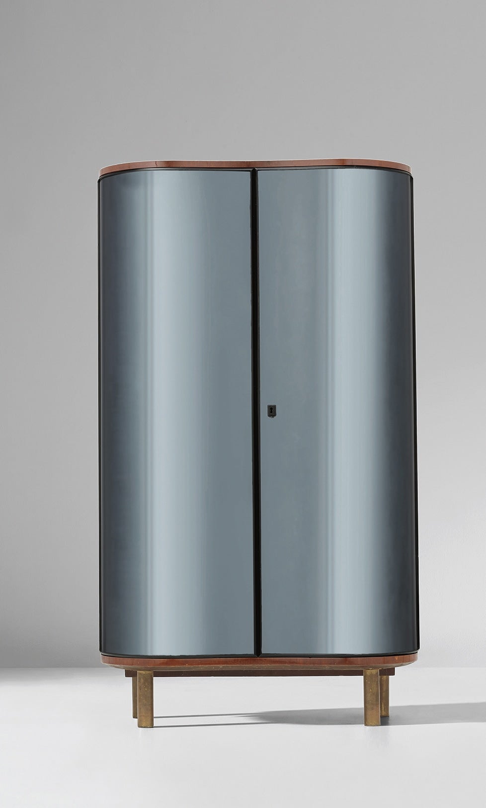 The present cabinet illustrates a duality in Chiesa’s work, uniting artisan and semi-industrial production, whilst subverting the rationalism of the rectilinear frame through the introduction of curvilinear forms, underscoring Ponti’s identification of the ‘extreme essentialness’ of these designs. In the late 1930s, a vocabulary of organic Modernism had been adopted by several architects and designers, informed by the Surrealist movement, which had emerged in Paris during the 1920s and developed through the 1930s. In addition to providing formal inspiration, Surrealism's exploration of the emotional and the psychological, offered a means to examine the humanising of technology. The undulating cabinet doors of the present cabinet have a biomorphic quality, a visual language that developed from Surrealism. In the 1936 exhibition ‘Cubism and Abstract Art’, Surrealist art was described as, ‘organic or biomorphic rather than geometric in its forms; curvilinear rather than rectilinear, decorative rather than structural and romantic rather than classical in its exaltation of the mystical, the spontaneous and the irrational’ (Barr, Alfred H., Jr., Cubism and Abstract Art, exh. cat., The Museum of Modern Art, New York, 1936, p. 19) Underscoring this contextualisation, is the distortion of the viewer’s reflection in the curved glass of the cabinet doors, which appears to collapse the distinction between object, subject and the surrounding space. Reflecting his pursuit of modernity, the present drinks cabinet is ‘specifically organic and essential’, the words used by André Breton in his 1937 Surrealist text Mad Love in reference to Paris - described by Ponti in his article as Chiesa’s favourite city, where he often visited to collect rare books from the Romantic period (André Breton, Mad Love, Mary Ann Caws, trans., Lincoln, 1987, p. 47 and Gio Ponti, 'L'opera di Pietro Chiesa', Domus, no. 234, March 1949, p. 46).