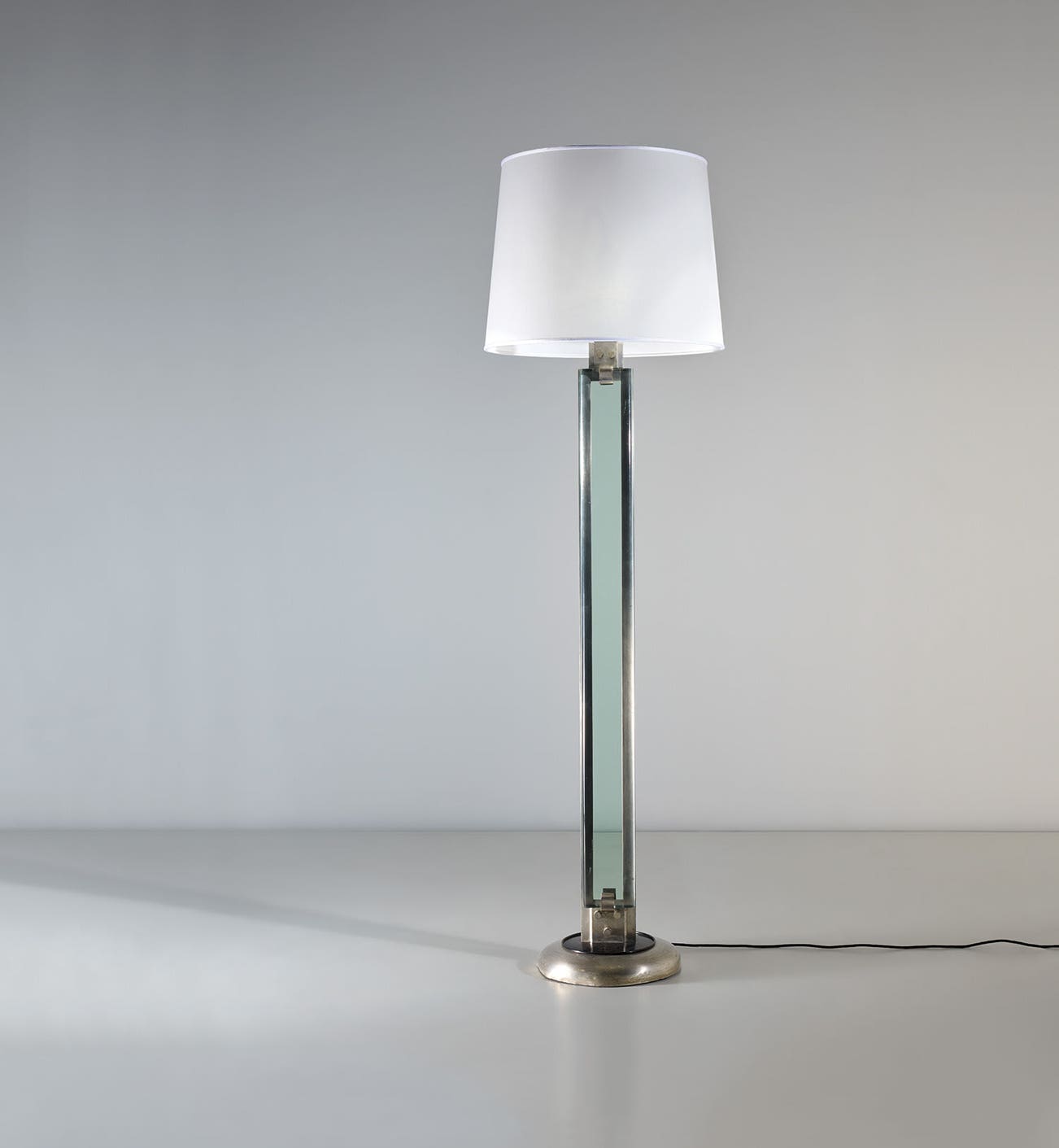 Glass, nickel-plated brass, nickel-plated steel, painted metal, paper shade.