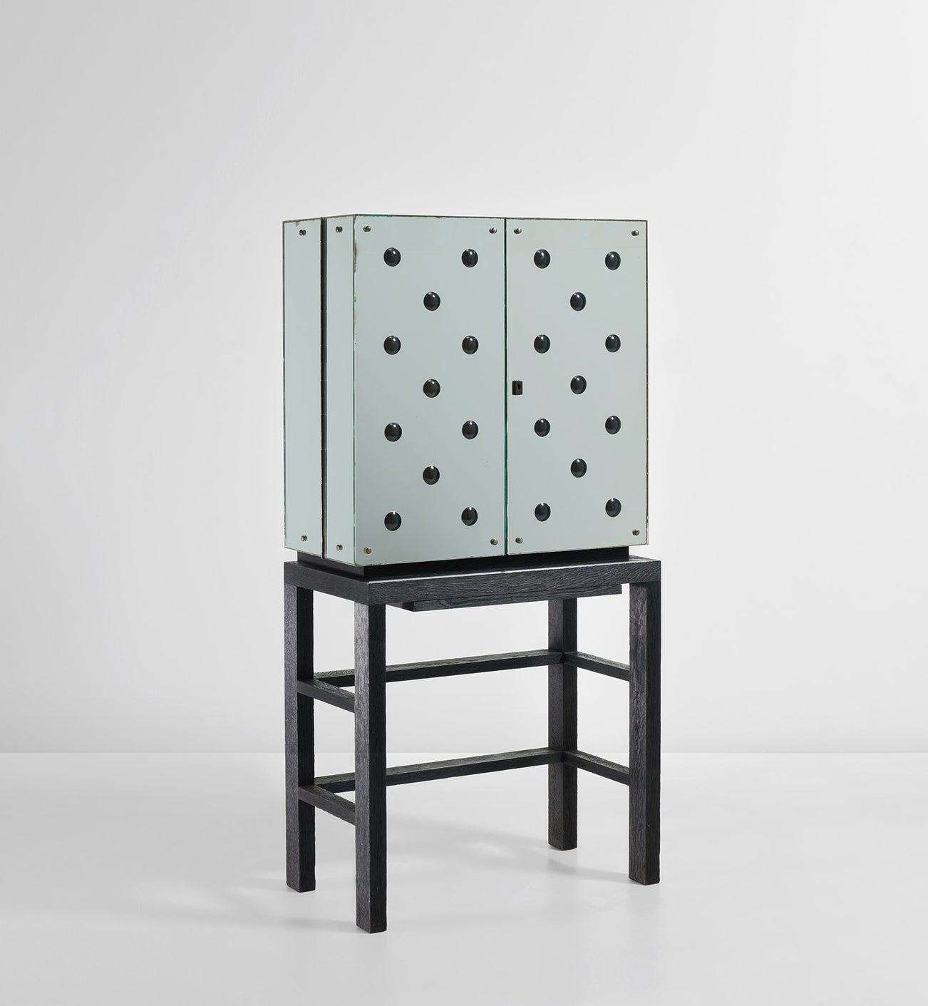 Mirrored glass, painted wood, glass, cane, nickel-plated brass.