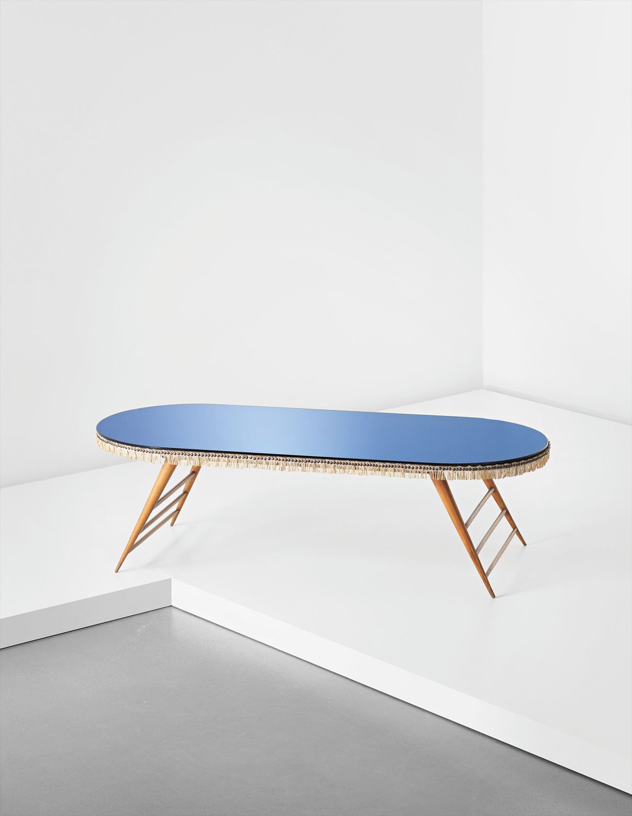 Coloured mirrored glass, fruitwood, fabric, metal.