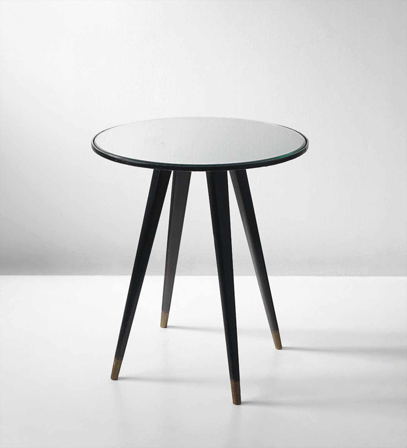 Mirrored glass, painted wood, brass.