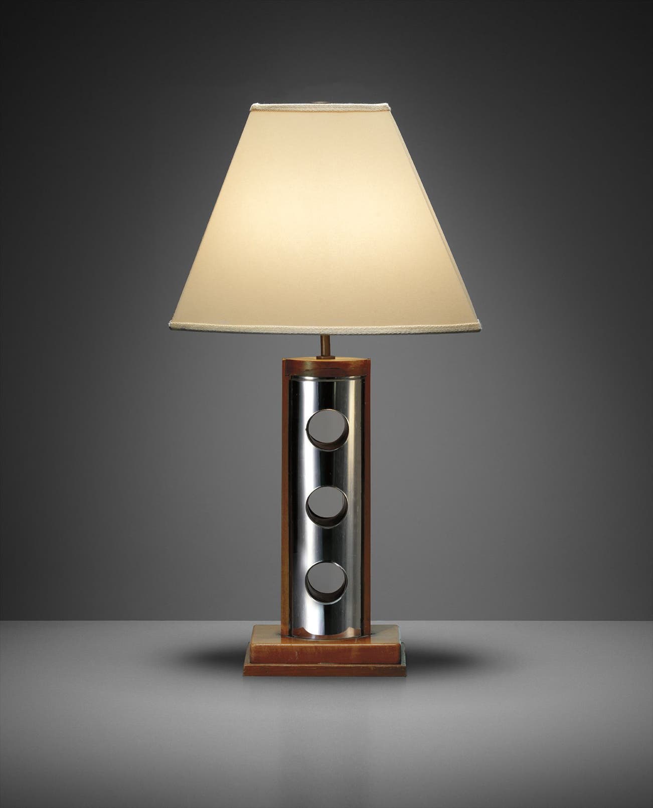 Pear wood, mirrored glass, brass, fabric shade.